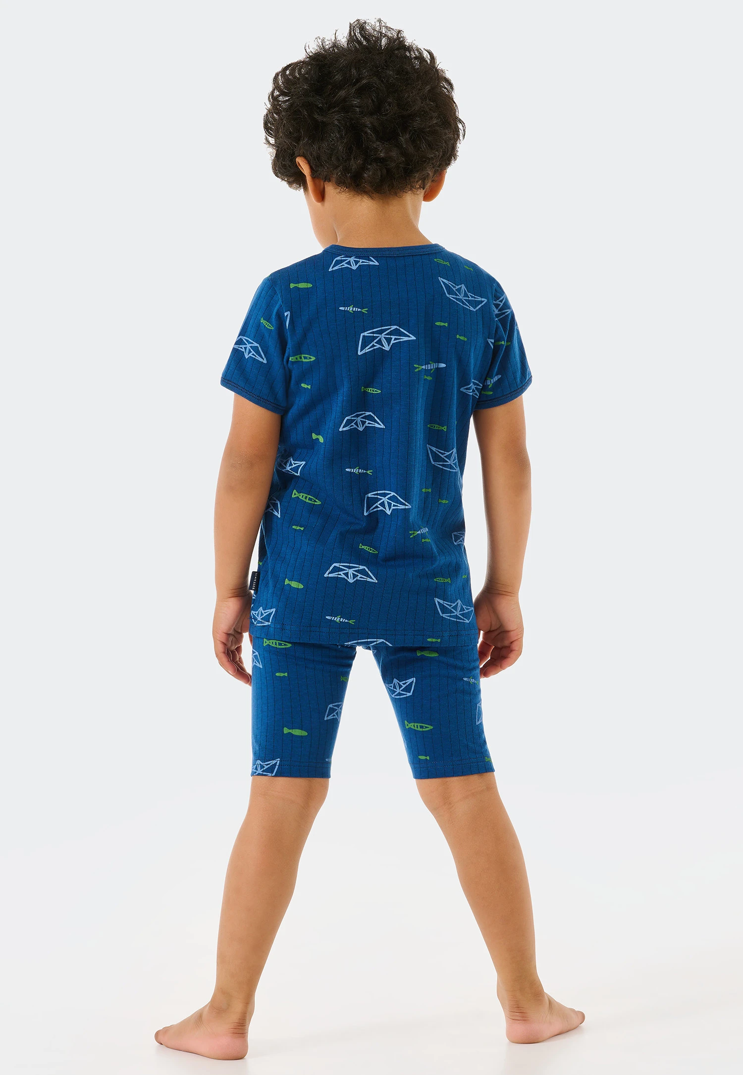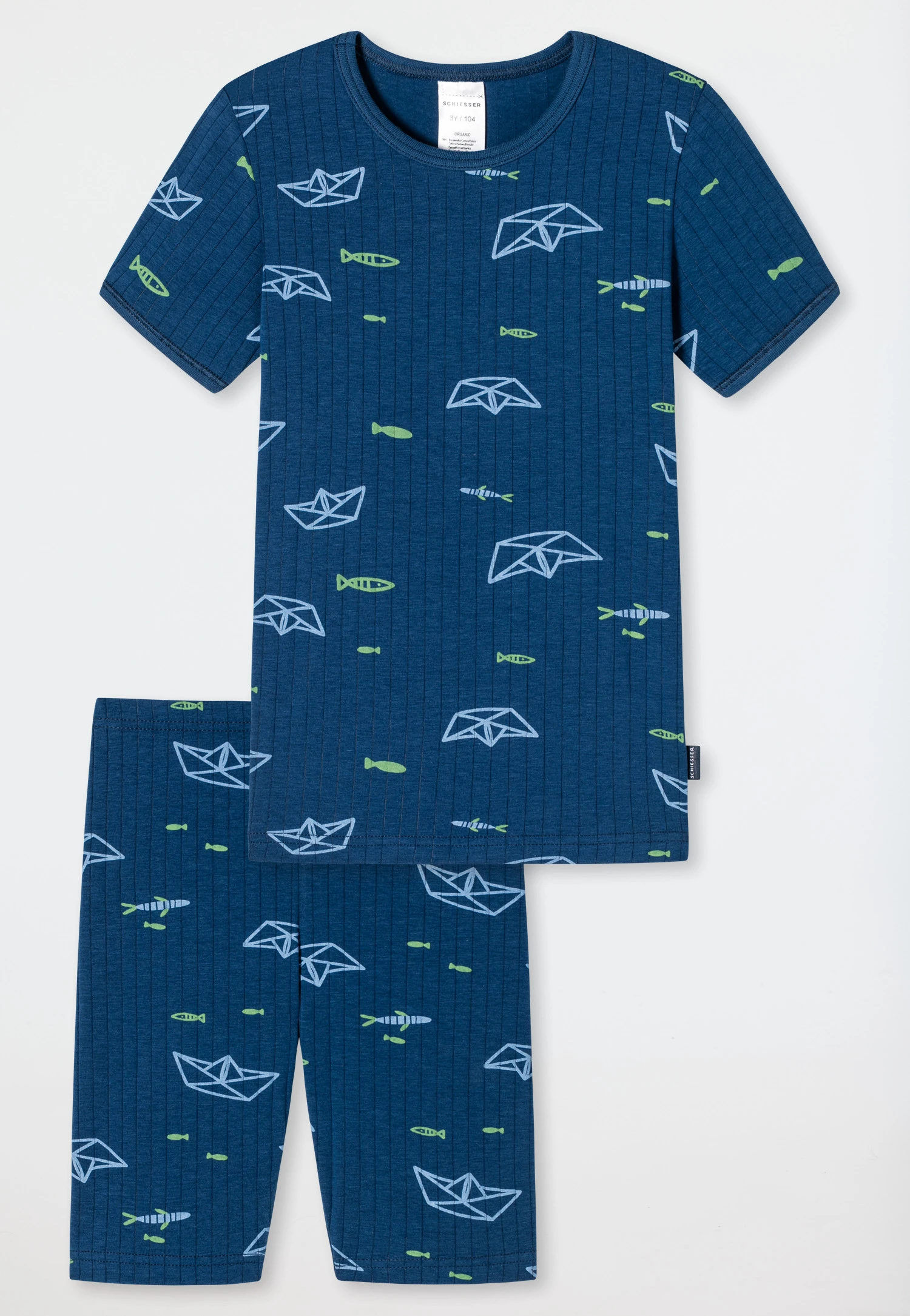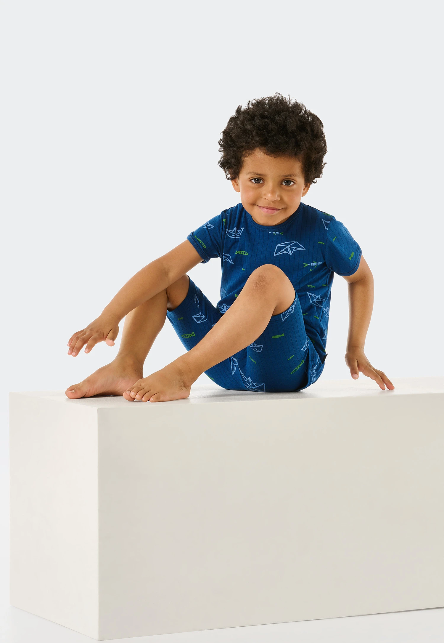 These short, blue boys’ pajamas are a real summer hit! The natural, ribbed Tencel material not only feels particularly soft on the skin, but also ensures a top-class wearing experience and a great deal of comfort all-round. The all-over pattern of attractive paper boats and little green fish is sure to make everyone’s hearts beat a little faster. The close-fitting pajama pants with a soft waistband sit perfectly on the body. For magical, relaxed nights in the best SCHIESSER quality.