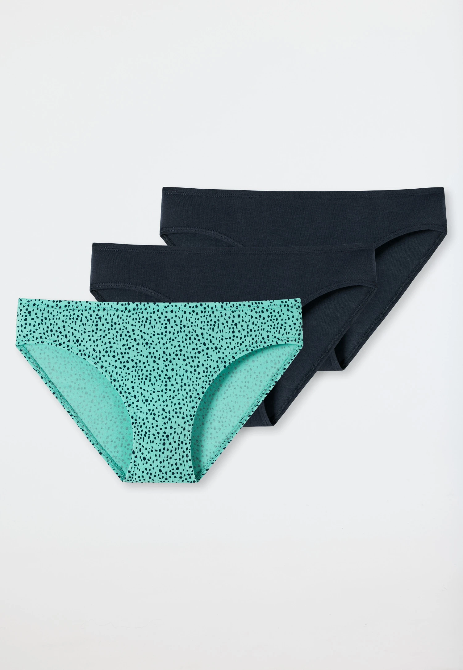These cool panties are the perfect underwear trio for trendy girls. Whether with black polka dots on mint or solid dark blue – this stylish look satisfies. Stretchy single jersey material made from organic cotton and a soft waistband feel perfect on the body and ensure great wearability. In the best SCHIESSER quality, of course!