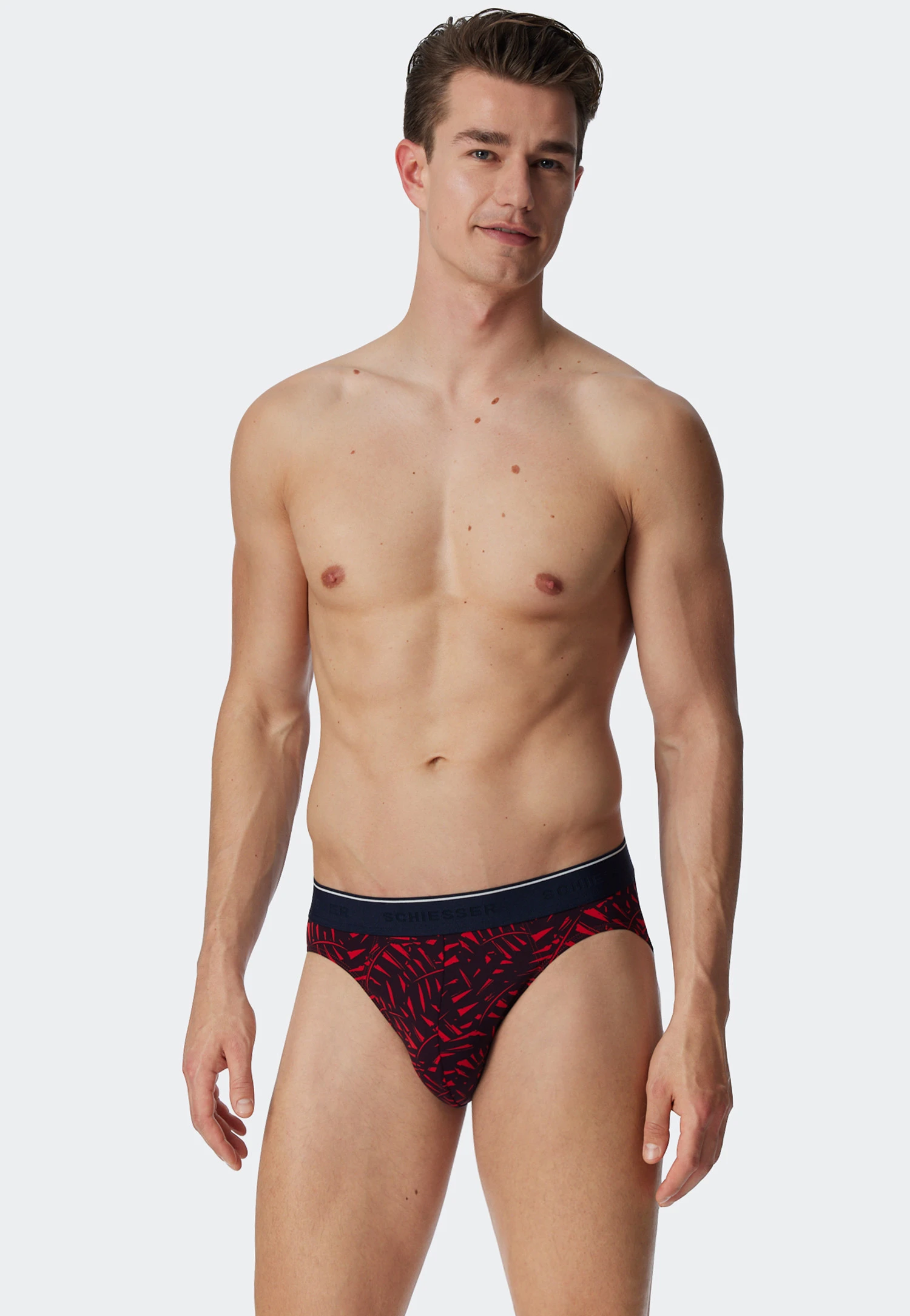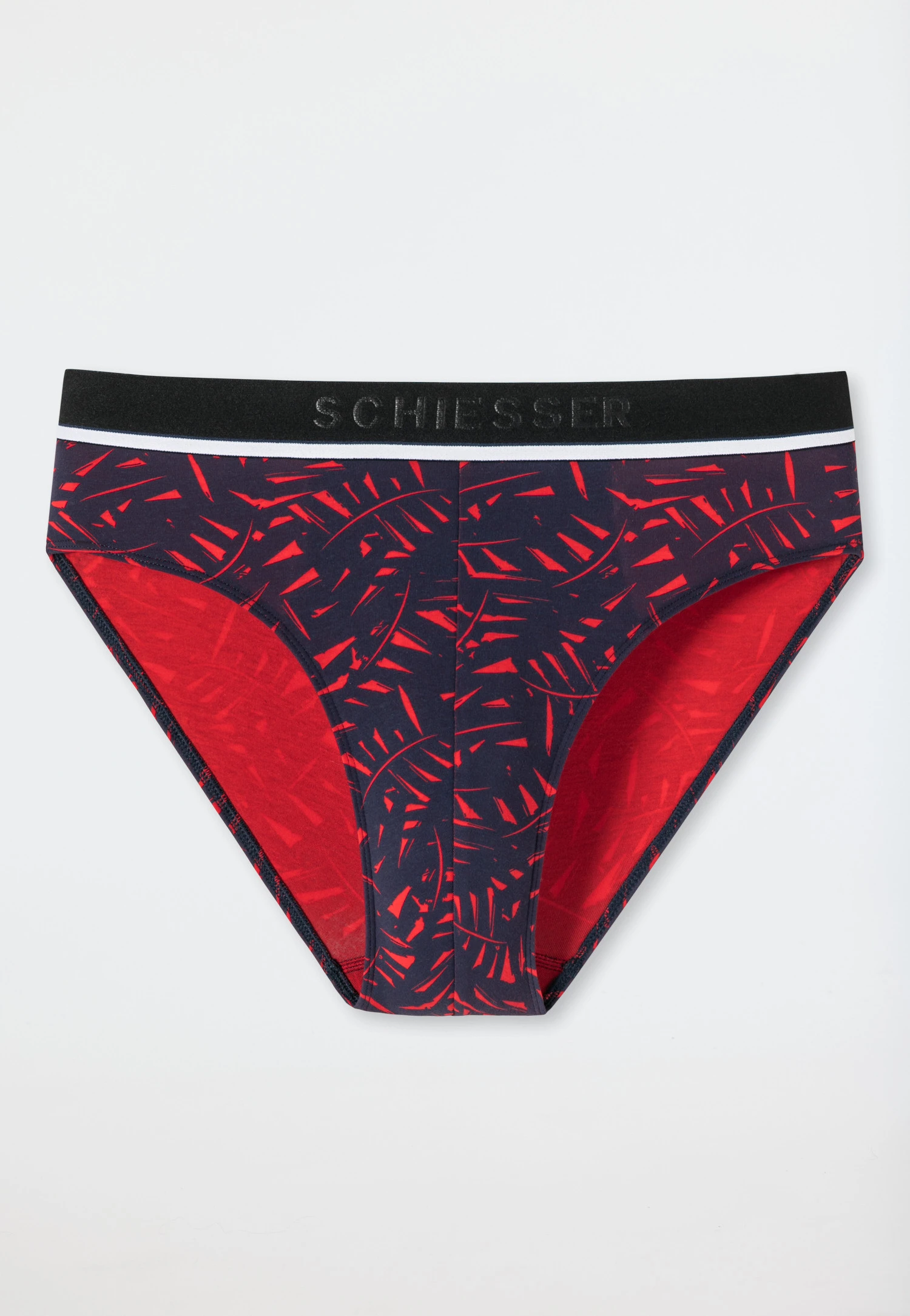 Modern men’s underwear with that certain something: these men’s dark blue Rio bikini briefs are an eye-catcher with their graphic leaf print in expressive red. The sporty, color-coordinated woven elastic waistband underlines the cool look of the daywear and ensures optimal support. Thanks to the high-quality micro fabric, these underpants are also noticeably soft on the skin. A comfortable brief with comfort and wow factor – in the proven best SCHIESSER quality, of course!