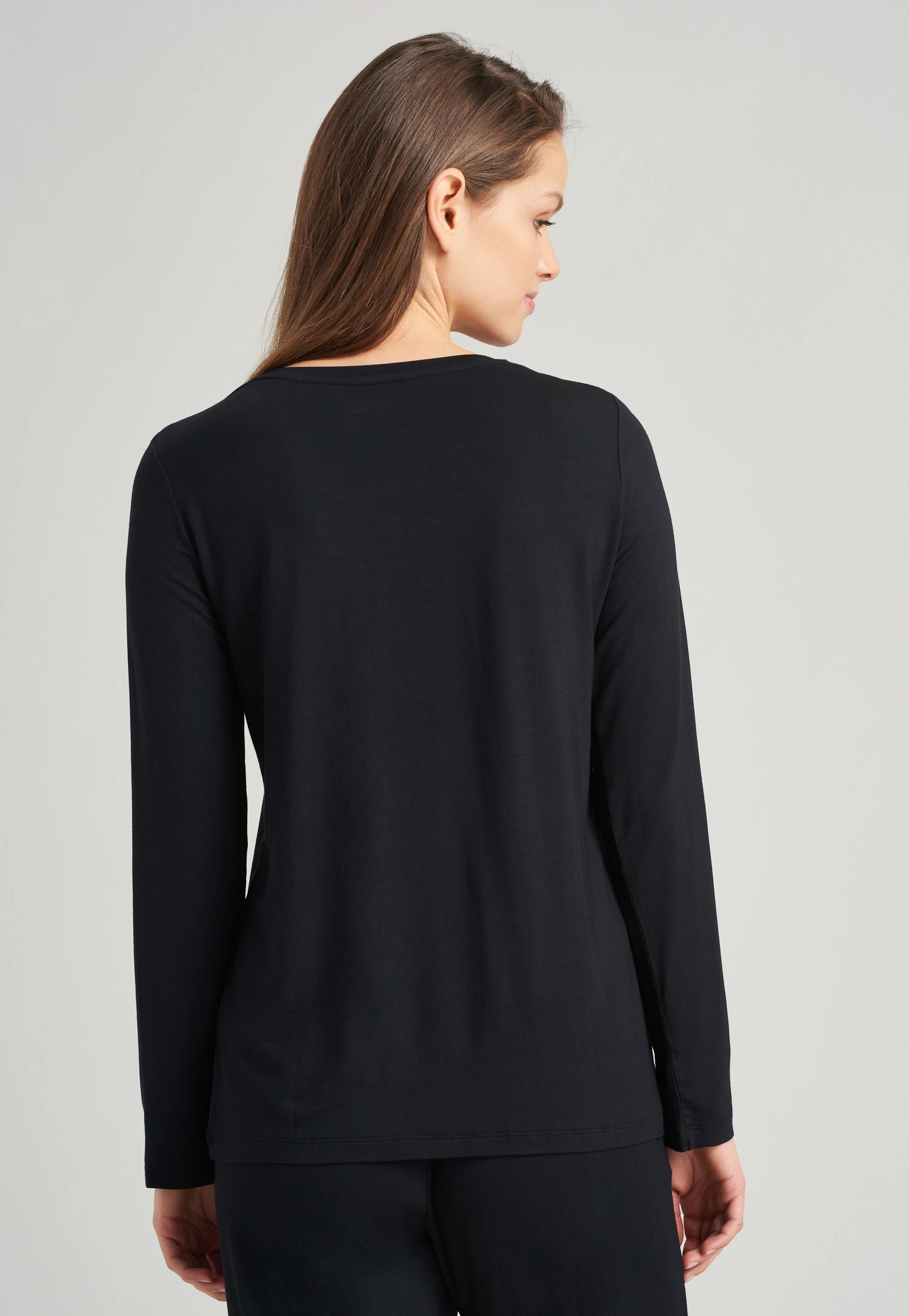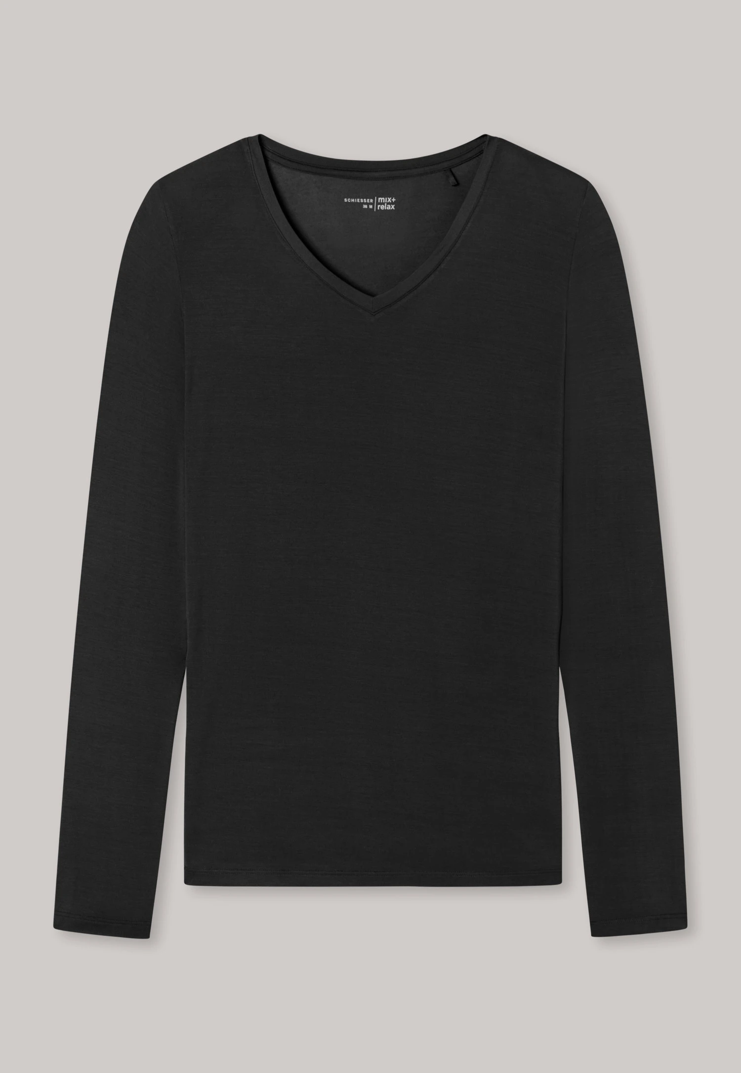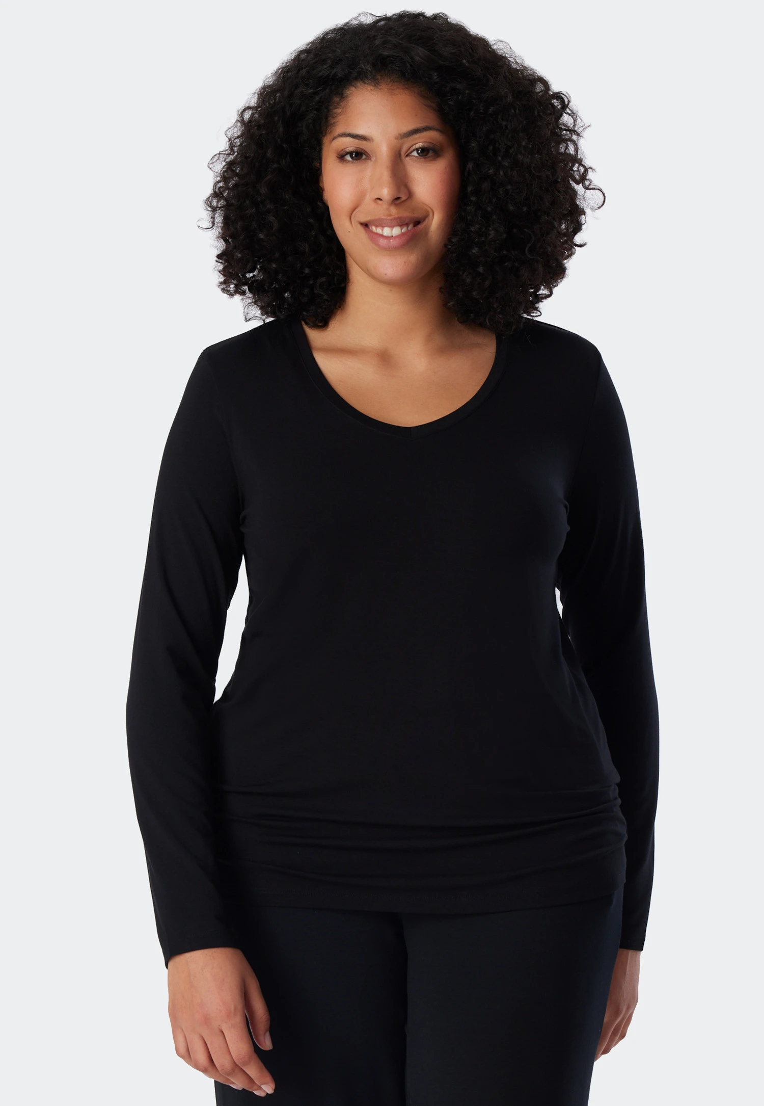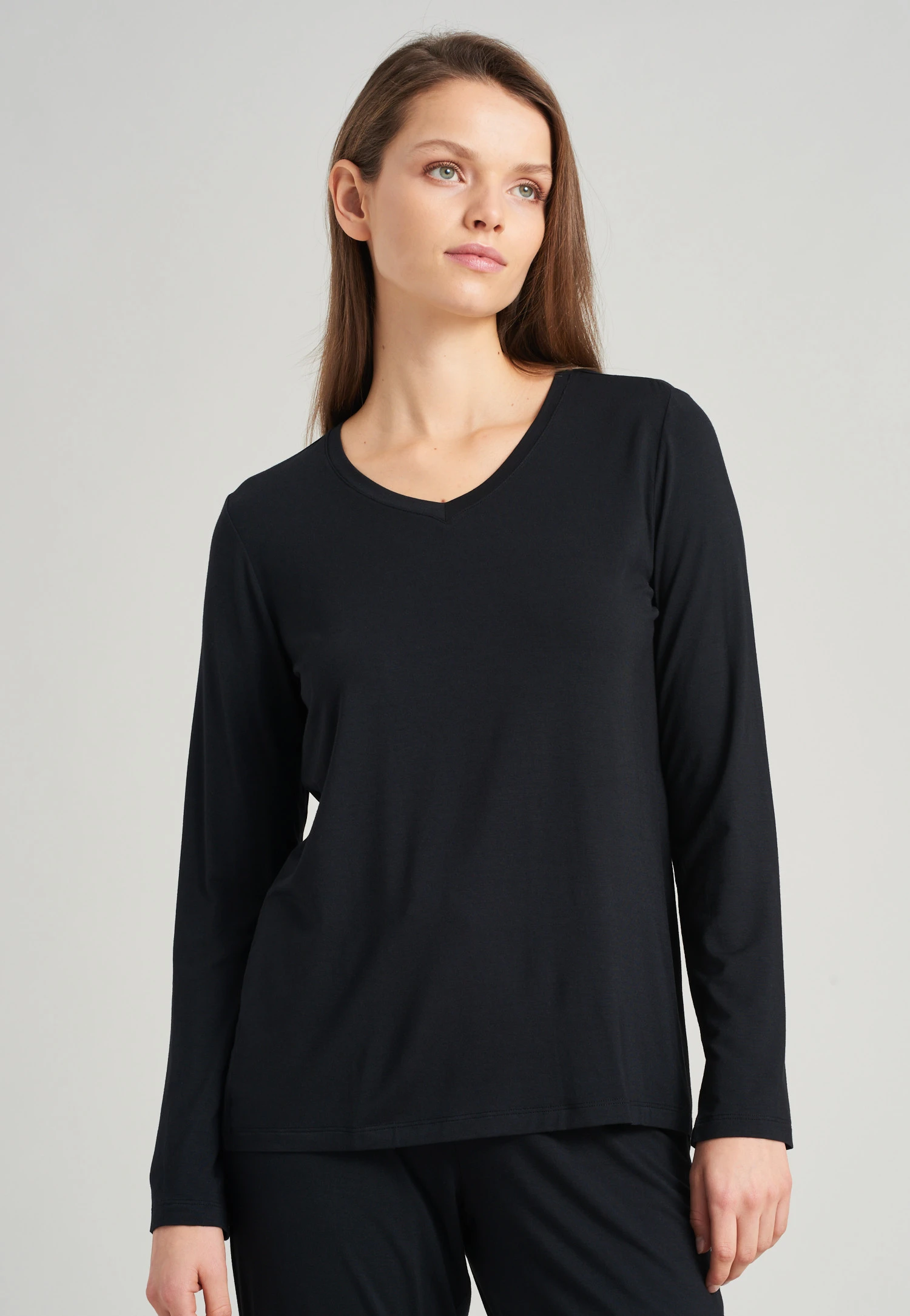 This basic long-sleeved shirt for women is a cuddly must-have! With its pleasant cut, it wonderfully, lightly caresses the body. The V-neck harmoniously rounds off the casual look. The feel-good secret is the stretchy single jersey made from natural modal. The super soft material flatters the skin, is breathable and easy to care for. Simply pair it with the matching pants from the Mix & Relax line – and this casual look in the best SCHIESSER quality is ready to go!