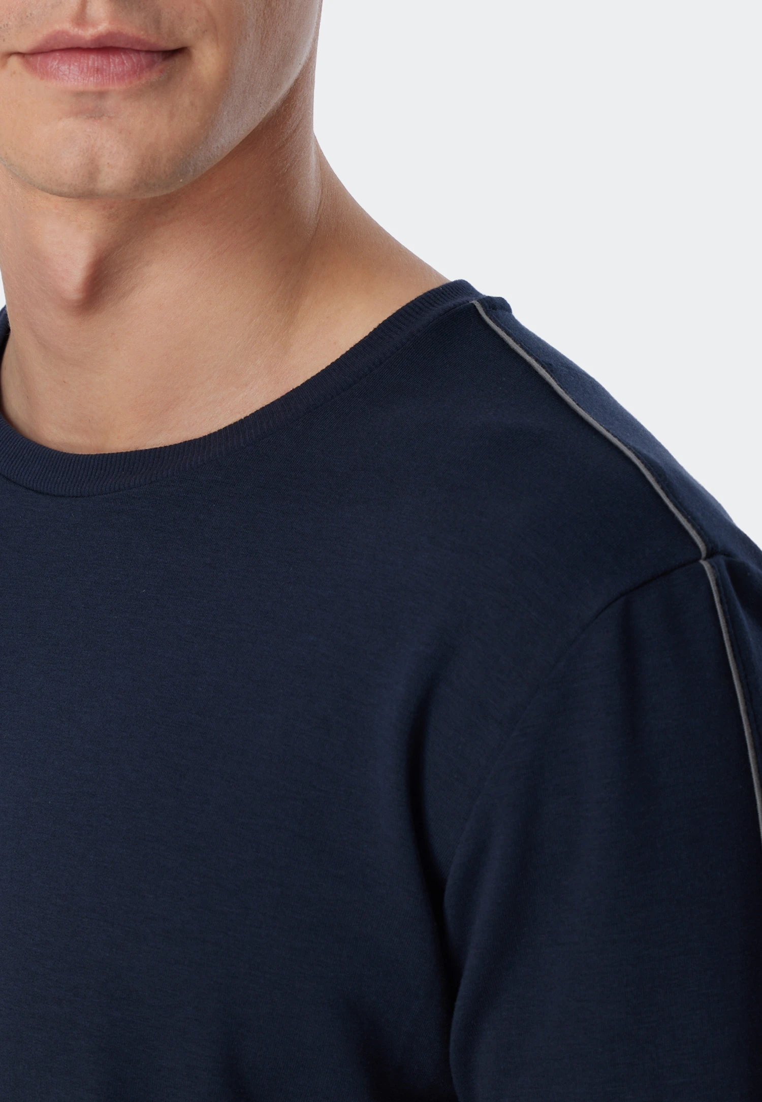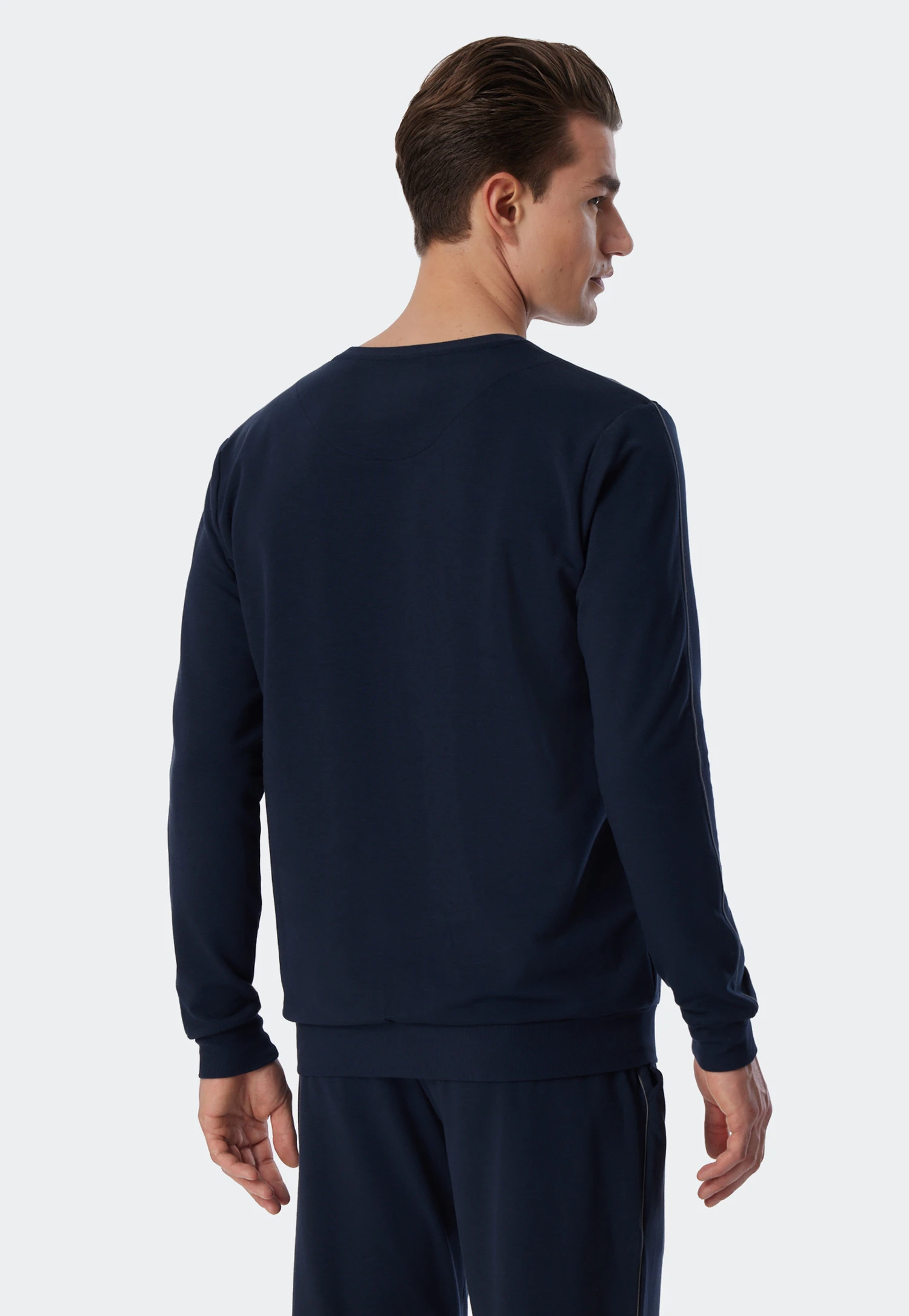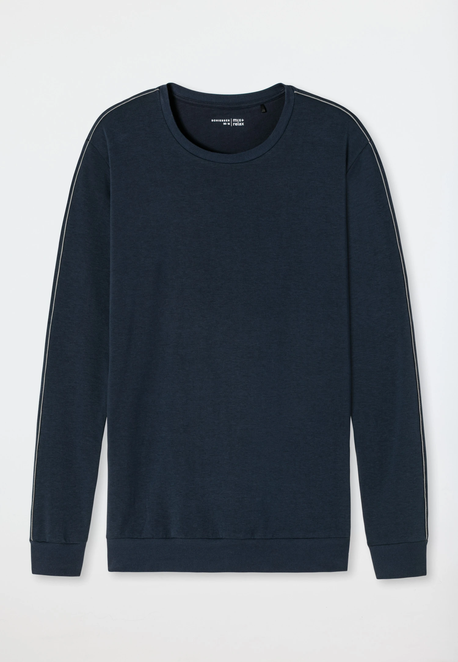 With this dark blue long-sleeved shirt for men you can relax and enjoy a good night’s sleep. With its casual cut and contrasting vertical seams, this sweater is on the cutting-edge of fashion. The ribbed cuffs on the crew neck, sleeves and on the hem are the perfect match. Stretchy sweatwear made of organic cotton and soft Tencel ensures a comfortable fit. The natural fibers are breathable and temperature-regulating. Best SCHIESSER quality!