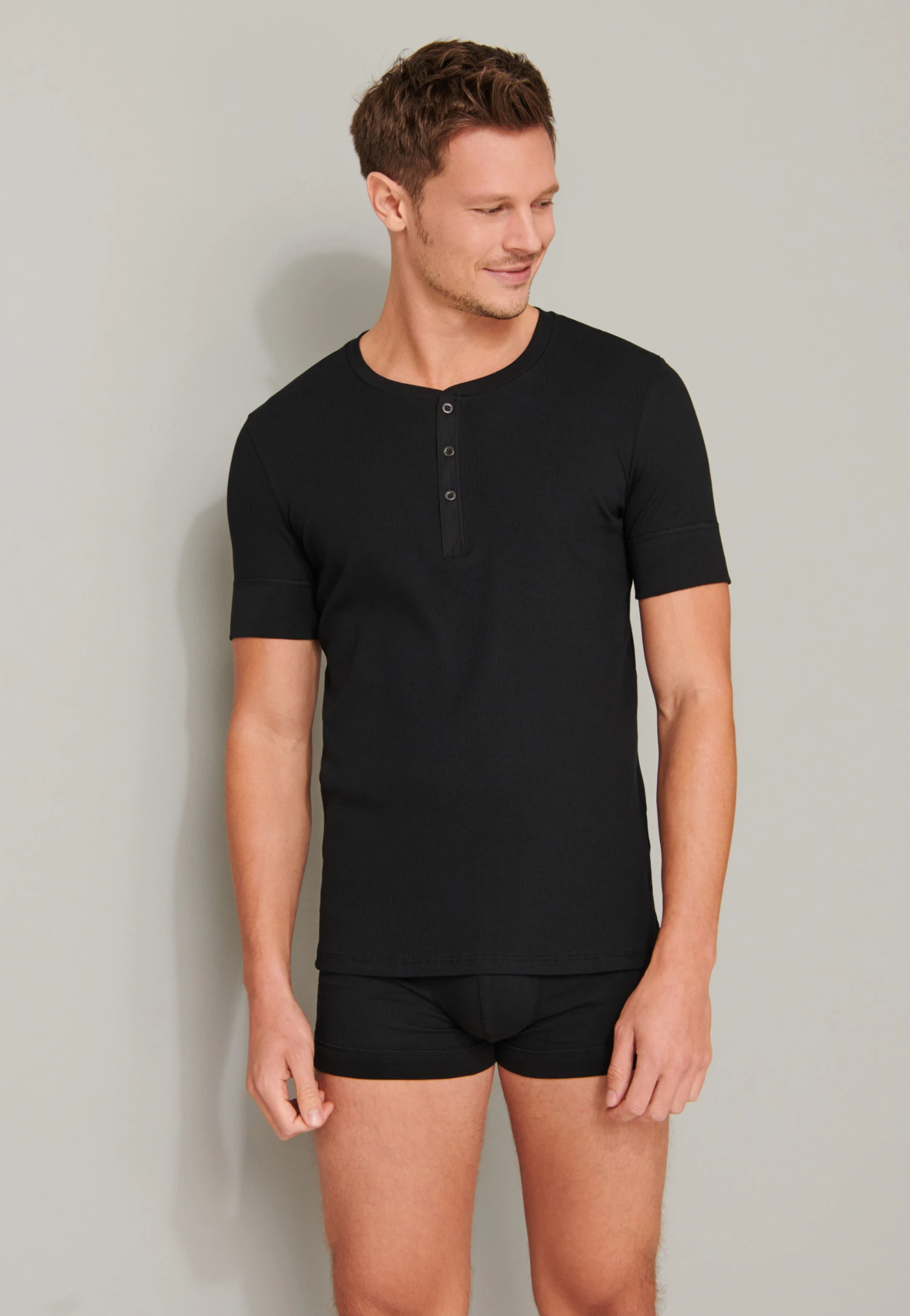 Iconic basics for real men: slip it on and feel good, that’s the motto of this men’s short-sleeved shirt from the SCHIESSER “Retro Rib” line. The stretchy double rib made of organic cotton not only feels particularly light and soft on the skin, it also exudes pure masculinity with its close-fitting cut and metal button placket. A comfortable, robust shirt in the best, sustainable SCHIESSER quality!