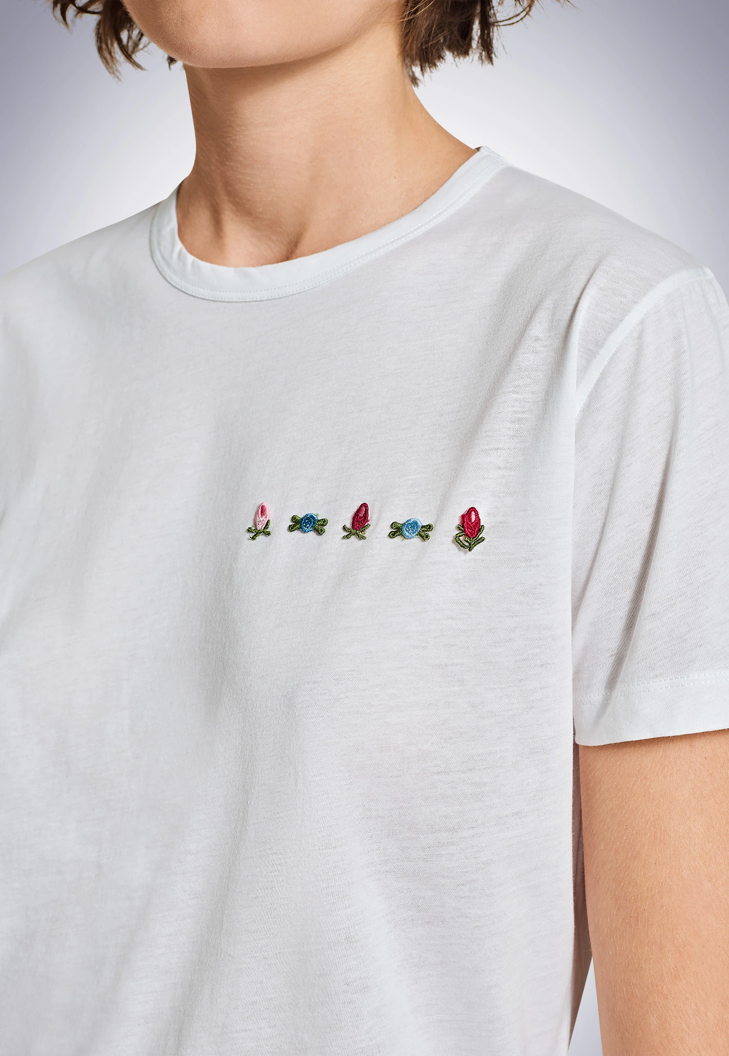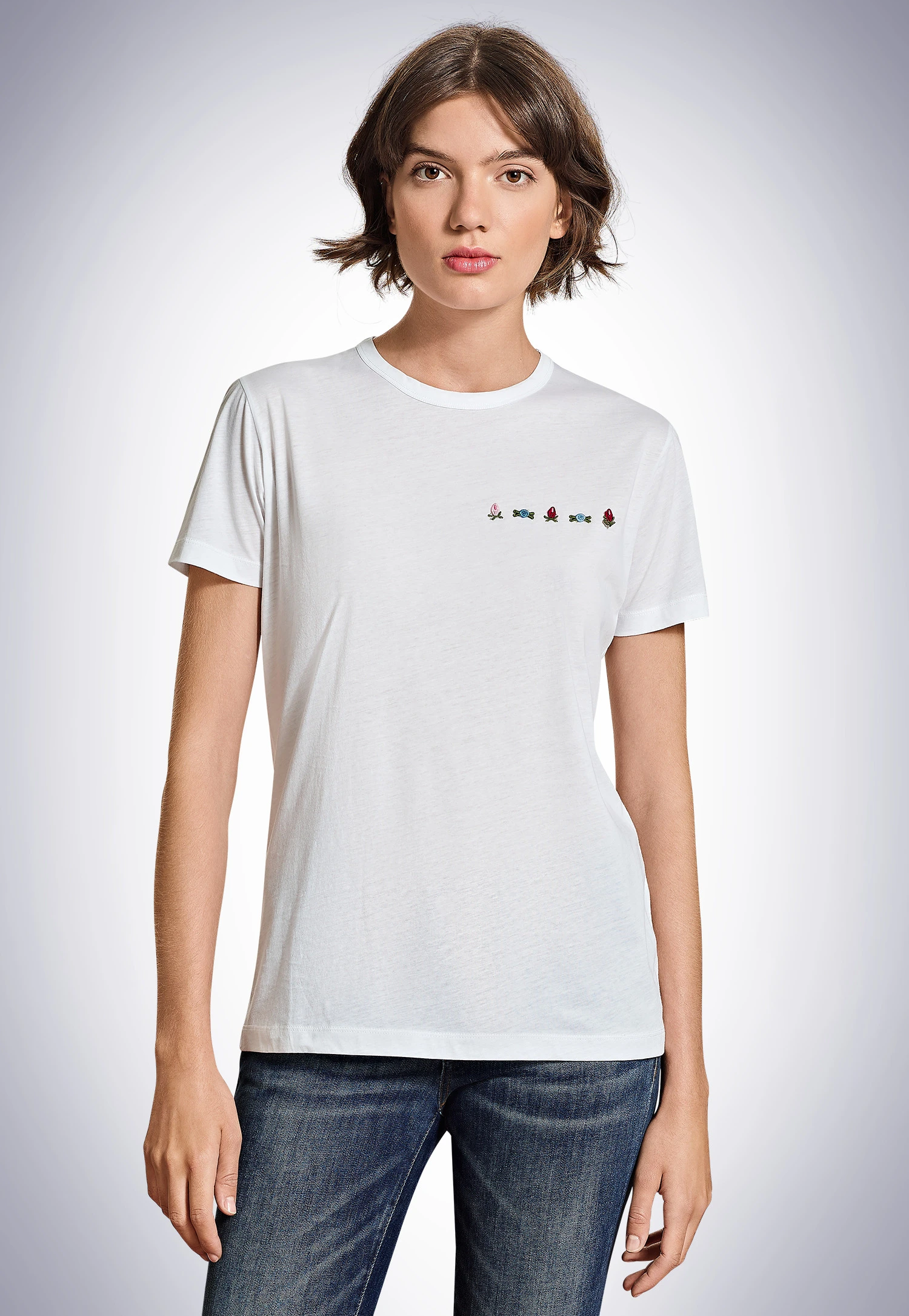 My name is Carla, “the unique one”. I’m a very special t-shirt. My premium single jersey made of the finest Supima cotton is not only extra soft. The material is also wonderfully smooth and has an elegant sheen, which shows you just how high quality I am. My wide cut makes me casual. Embroidered flowers on the chest make me distinctive. Whether it’s feminine with a cardigan or sporty with denim – I make every outfit exceptional.