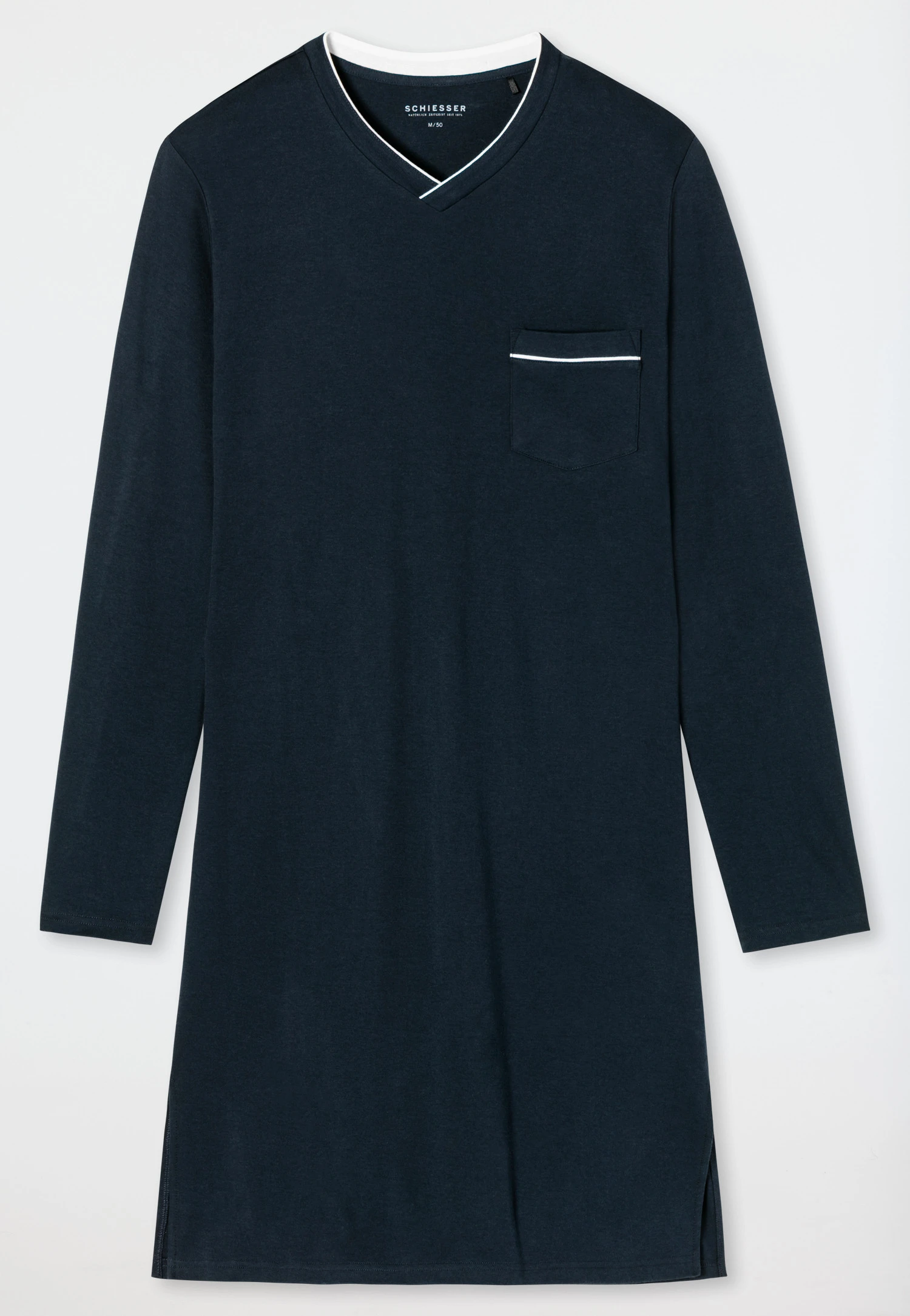 Masculine, comfortable, uncomplicated – this men’s dark blue sleep shirt fulfills all wishes. Thanks to its high-quality interlock made of 100% cotton and side slits on the hem, this long-sleeved sleep shirt is particularly comfortable. The V-neck and breast pocket are adorned with white piping. An elegant classic in the best SCHIESSER quality!