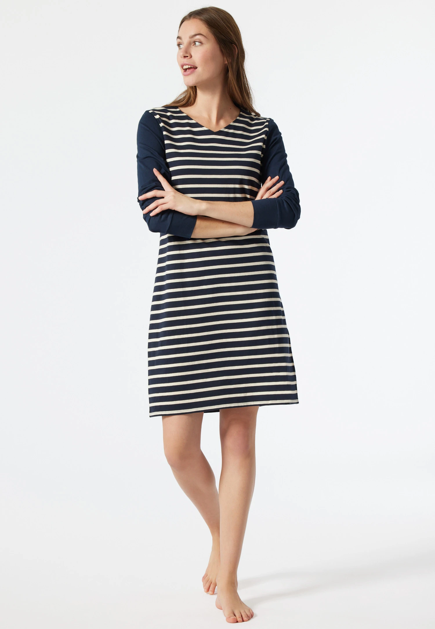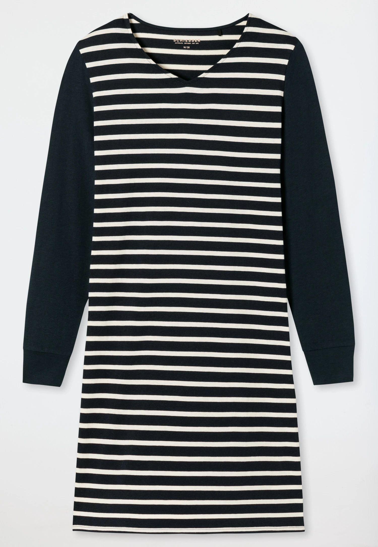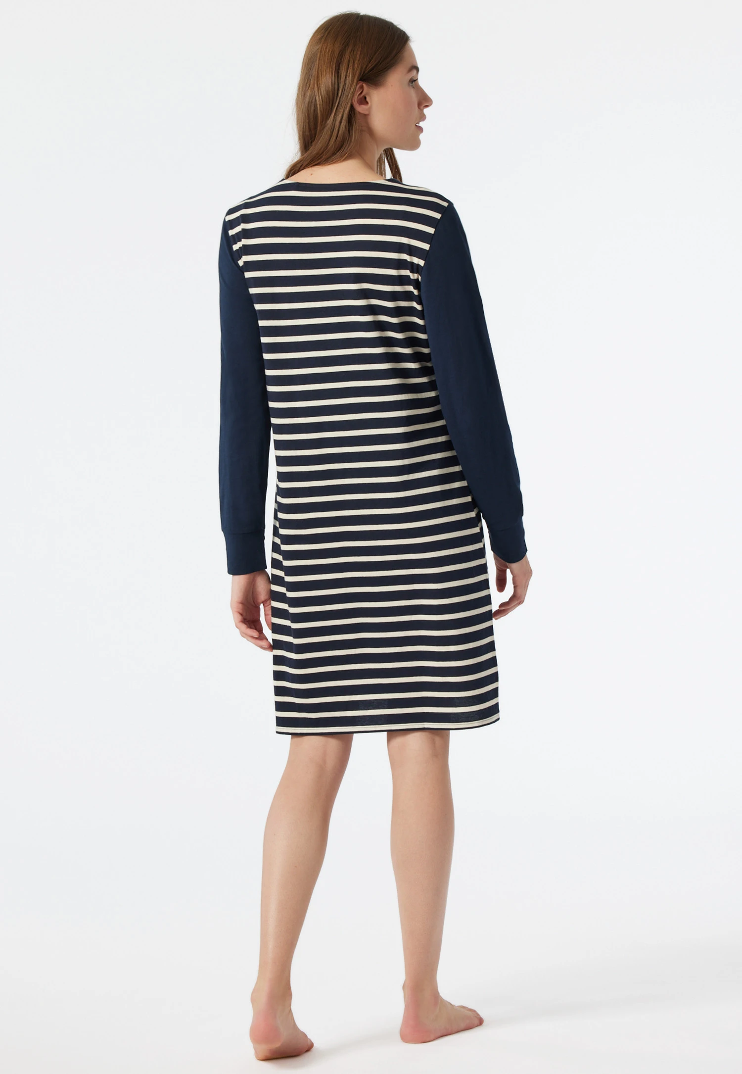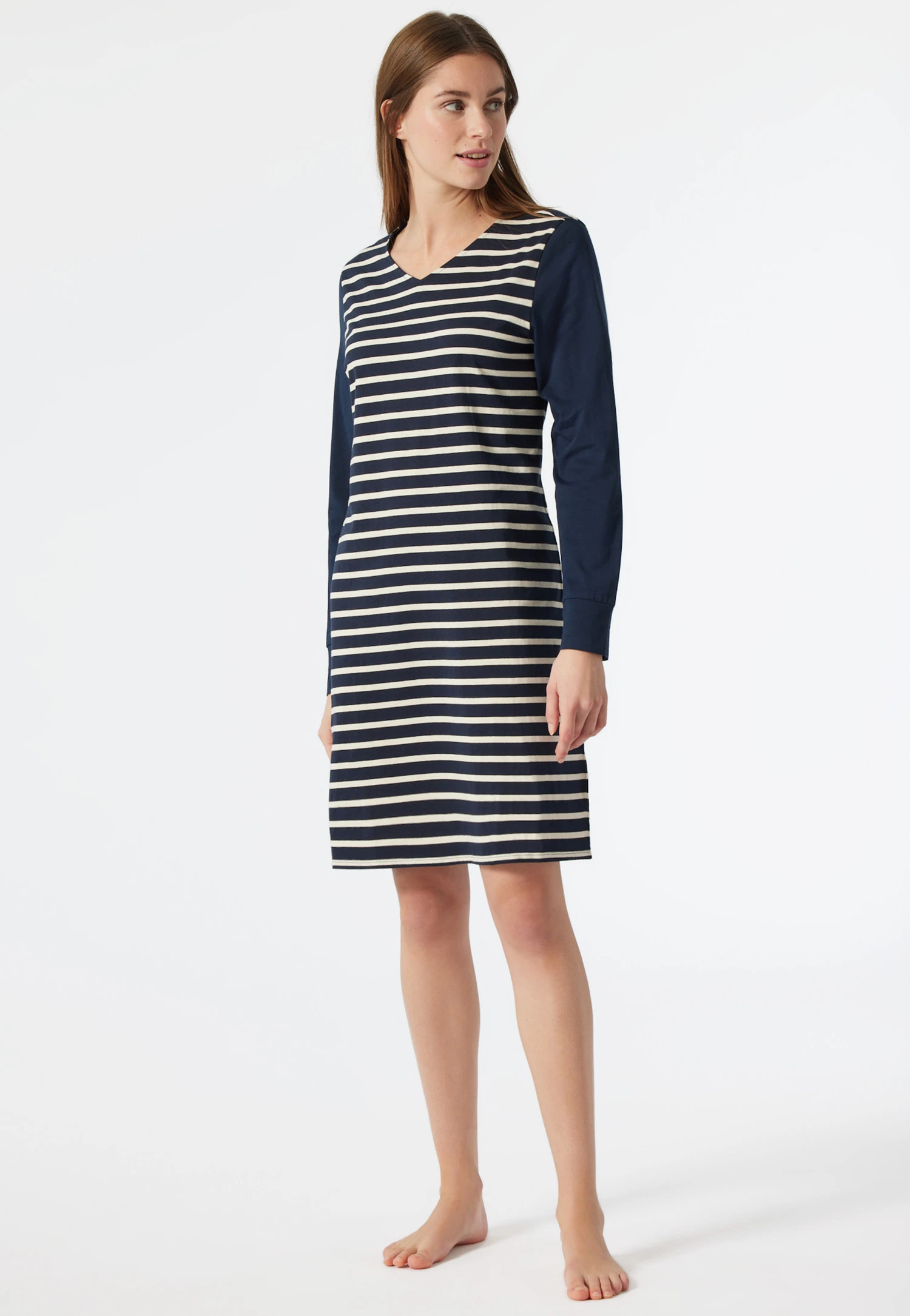 A sporty, casual look is what makes this long-sleeved sleep shirt for women so charming! The knitted Breton stripes exude a foreign flair; the sleeves with wide cuffs are offset in a solid color. With its flattering silhouette and pleasant V-neck, this sleep shirt is also wonderfully comfortable. The soft single jersey made from 100% pure cotton guarantees a cuddly, comfortable feel. Enjoy sleepwear in the best SCHIESSER quality!