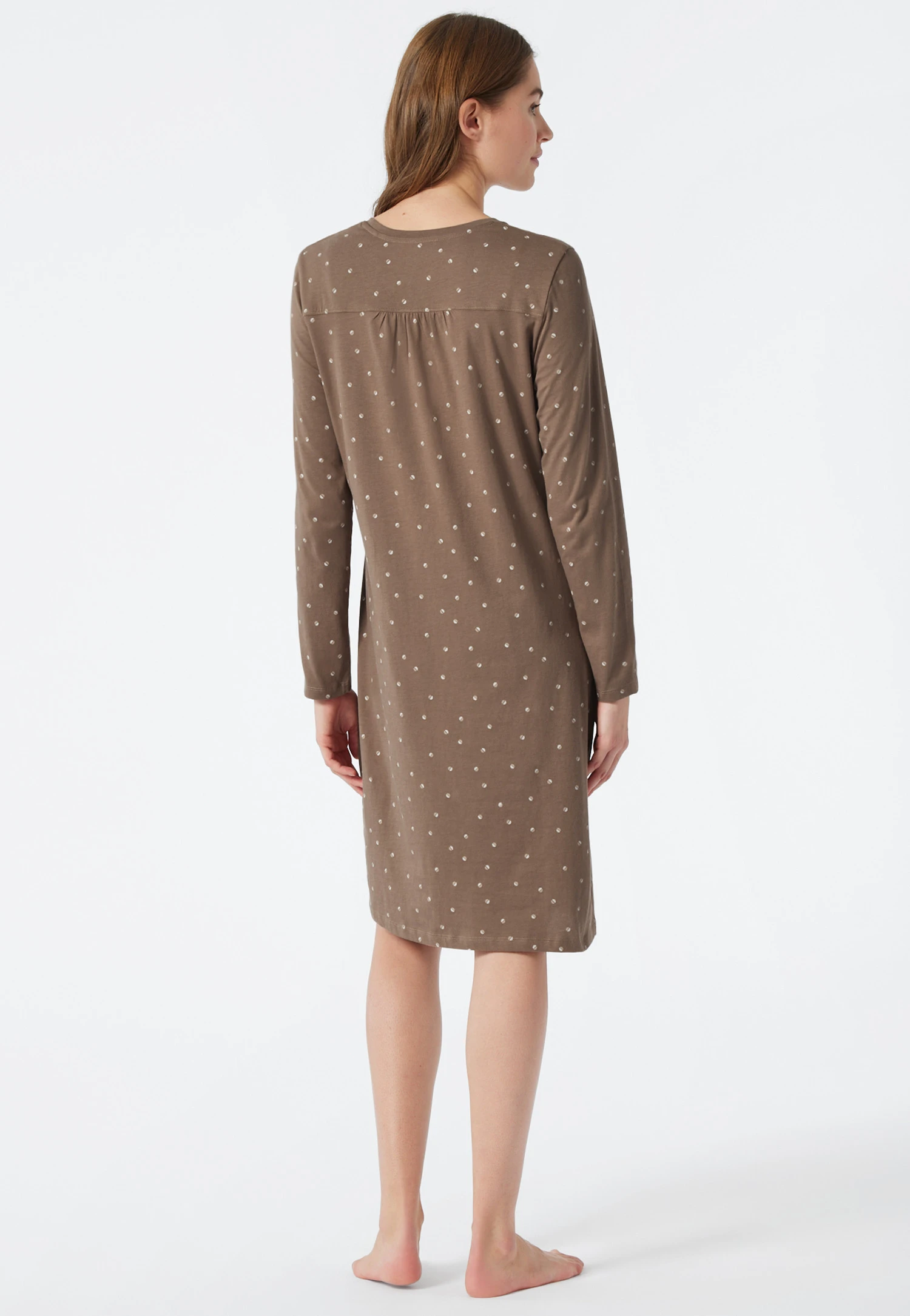 Charming design and maximum comfort: this long-sleeved sleep shirt for women does both! With its minimalist polka dot print, it simply looks good. The casual look is underlined by the relaxed silhouette, V-neck and pleats on the back, which ensure plenty of freedom of movement. Single jersey made from 100% pure cotton caresses your body in a wonderfully soft way. The perfect choice for anyone who loves sleepwear in the best SCHIESSER quality!