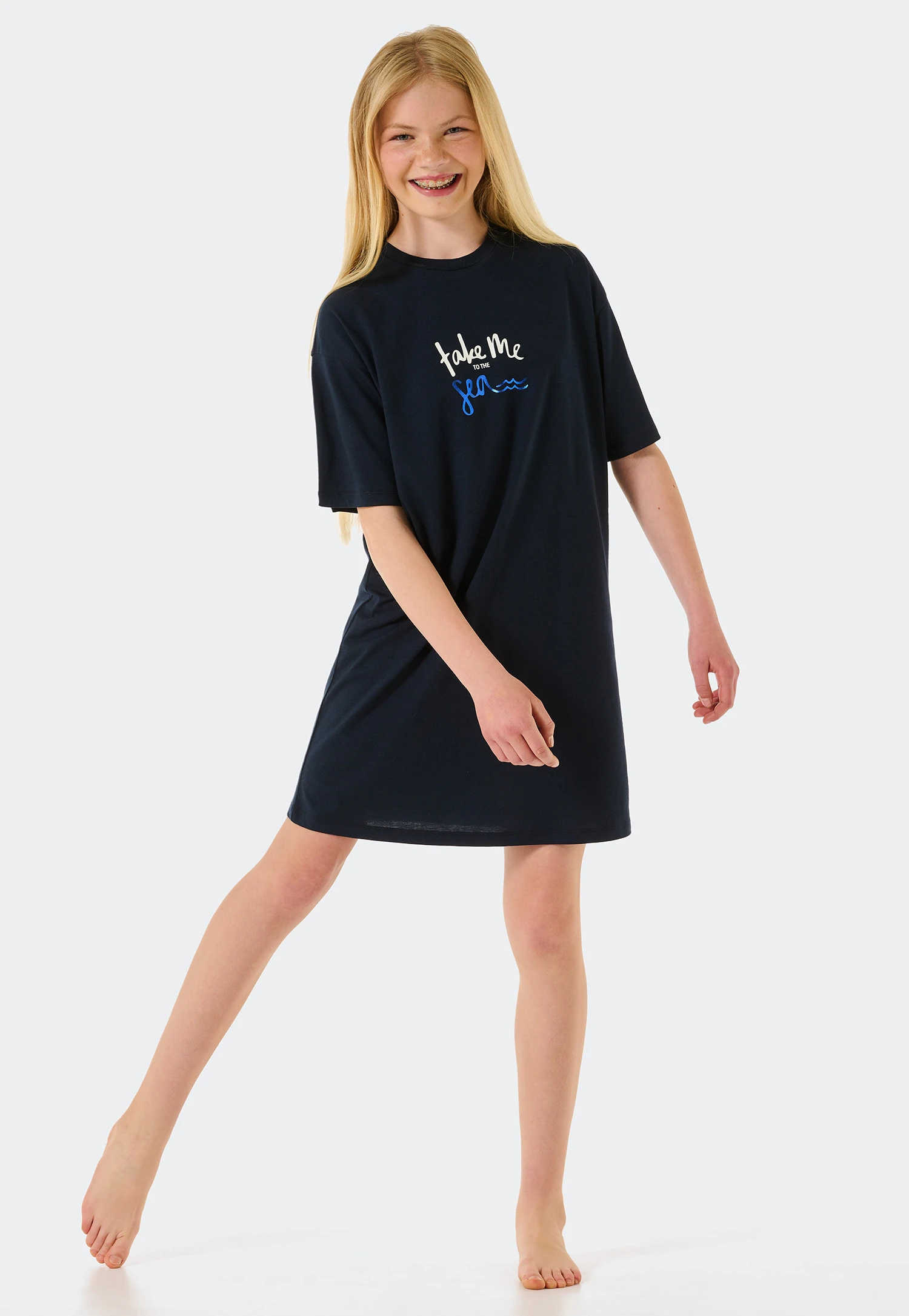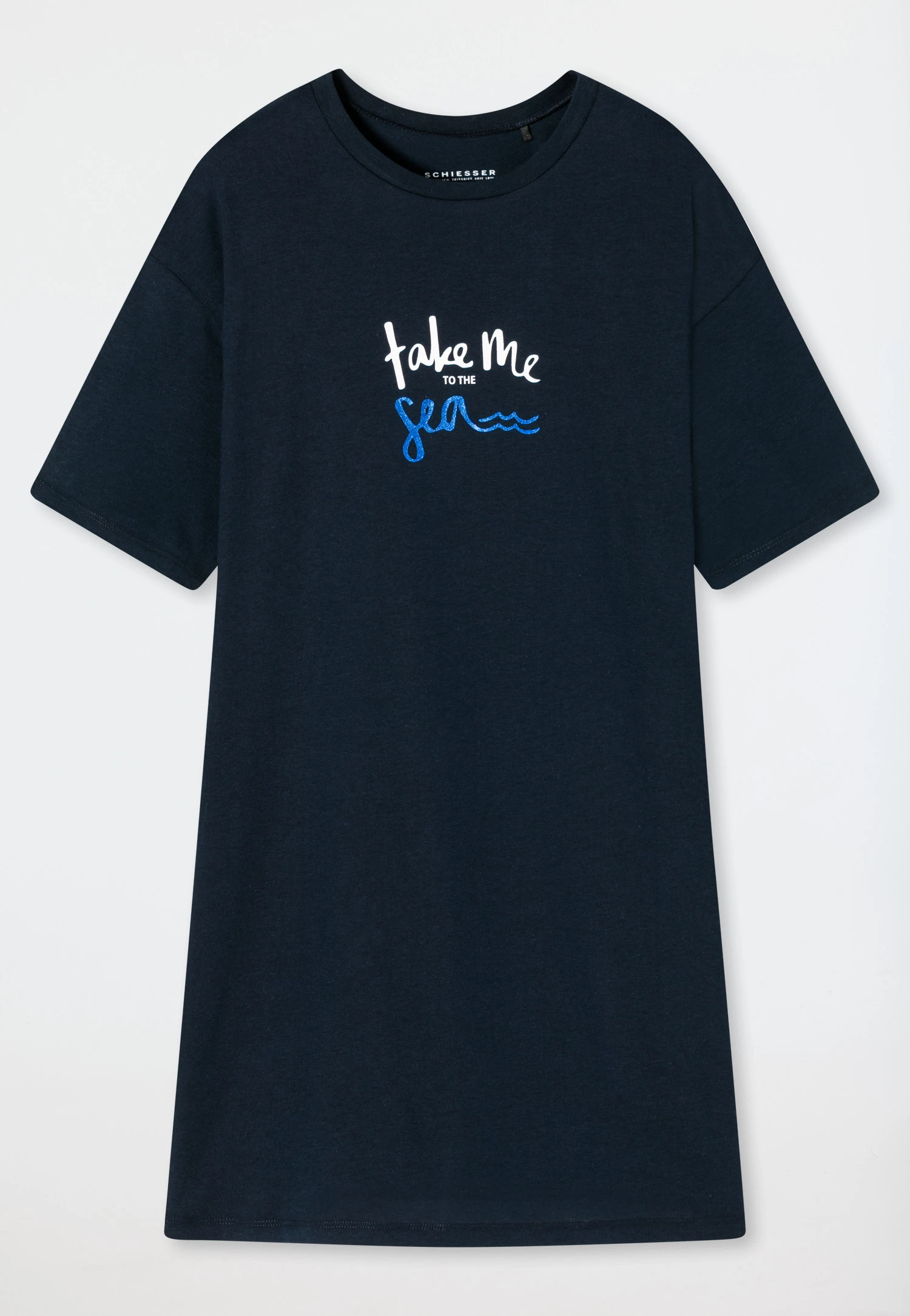 A clean look in dark blue makes this girls’ sleep shirt a real favorite! This sleep shirt delights trendy girls with its short sleeves and crew neck. A fashionable eye-catcher is the blue and white “take me TO THE Sea” lettering on the chest. The soft single jersey made of pure organic cotton ensures a high level of comfort. A summery design with feel-good guarantee in the best SCHIESSER quality!