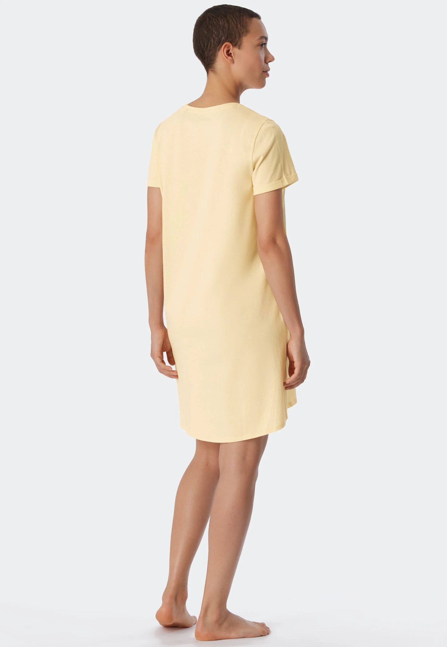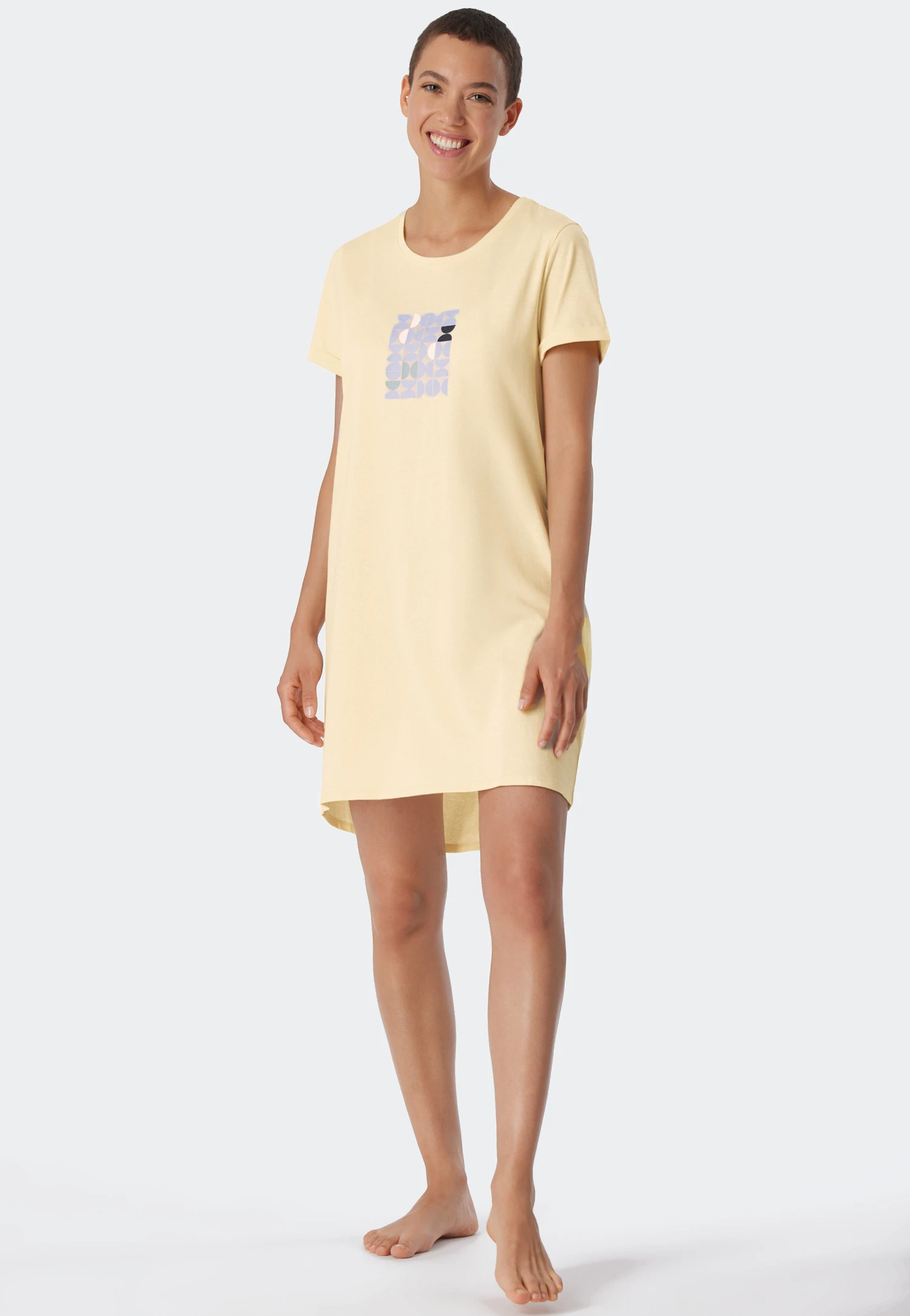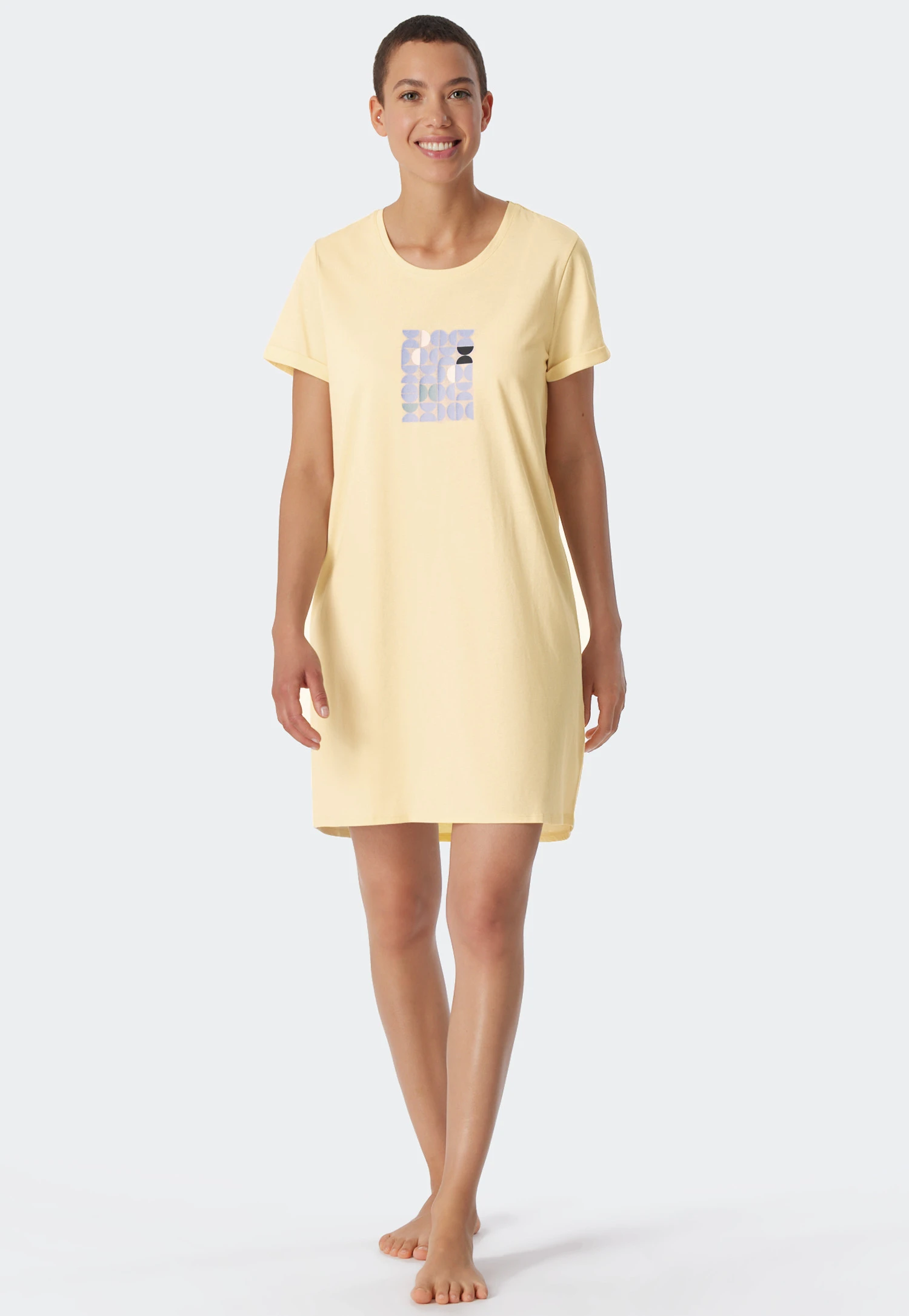 This black short-sleeved sleep shirt for women is both casual and comfortable! The multicolored graphic print on the chest makes a nice accent. The fashionably turned-up sleeves and the hem that’s rounded and extended at the back help create an uncomplicated, sporty look. The crew neck features pleasantly soft edging. Enjoy a feeling of pure well-being thanks to the material: single jersey made from skin-friendly organic cotton that’s not only soft, but also sustainable. Dream away in the best SCHIESSER quality!