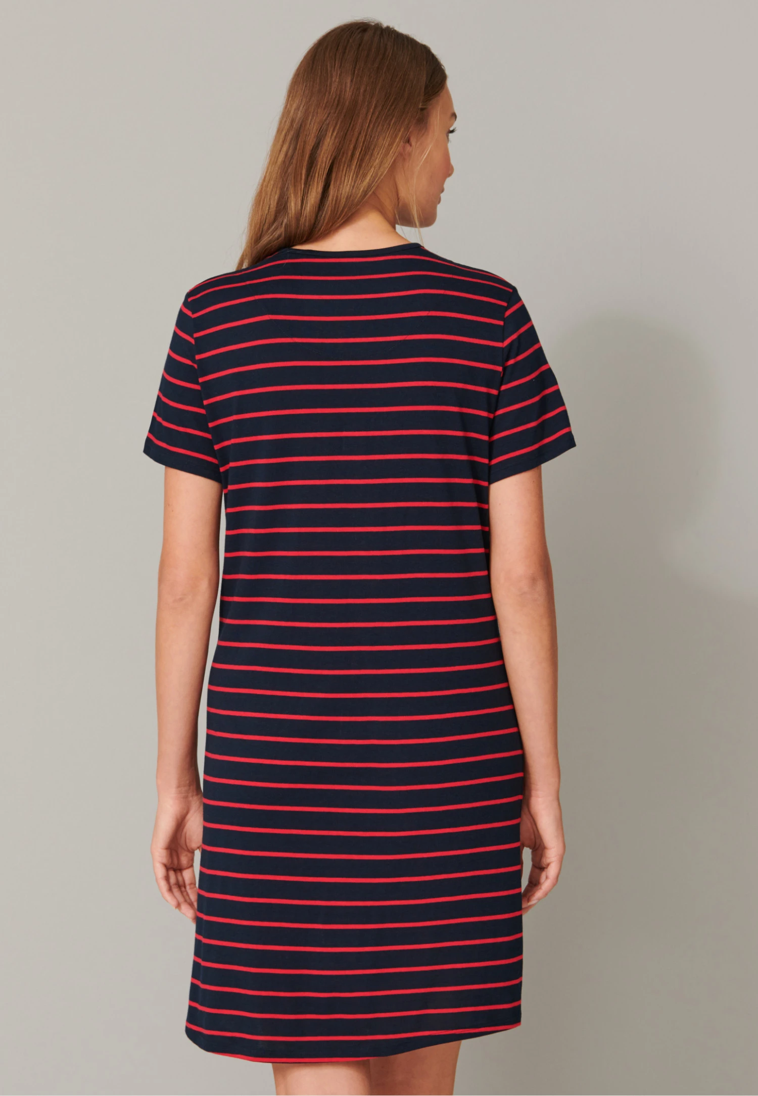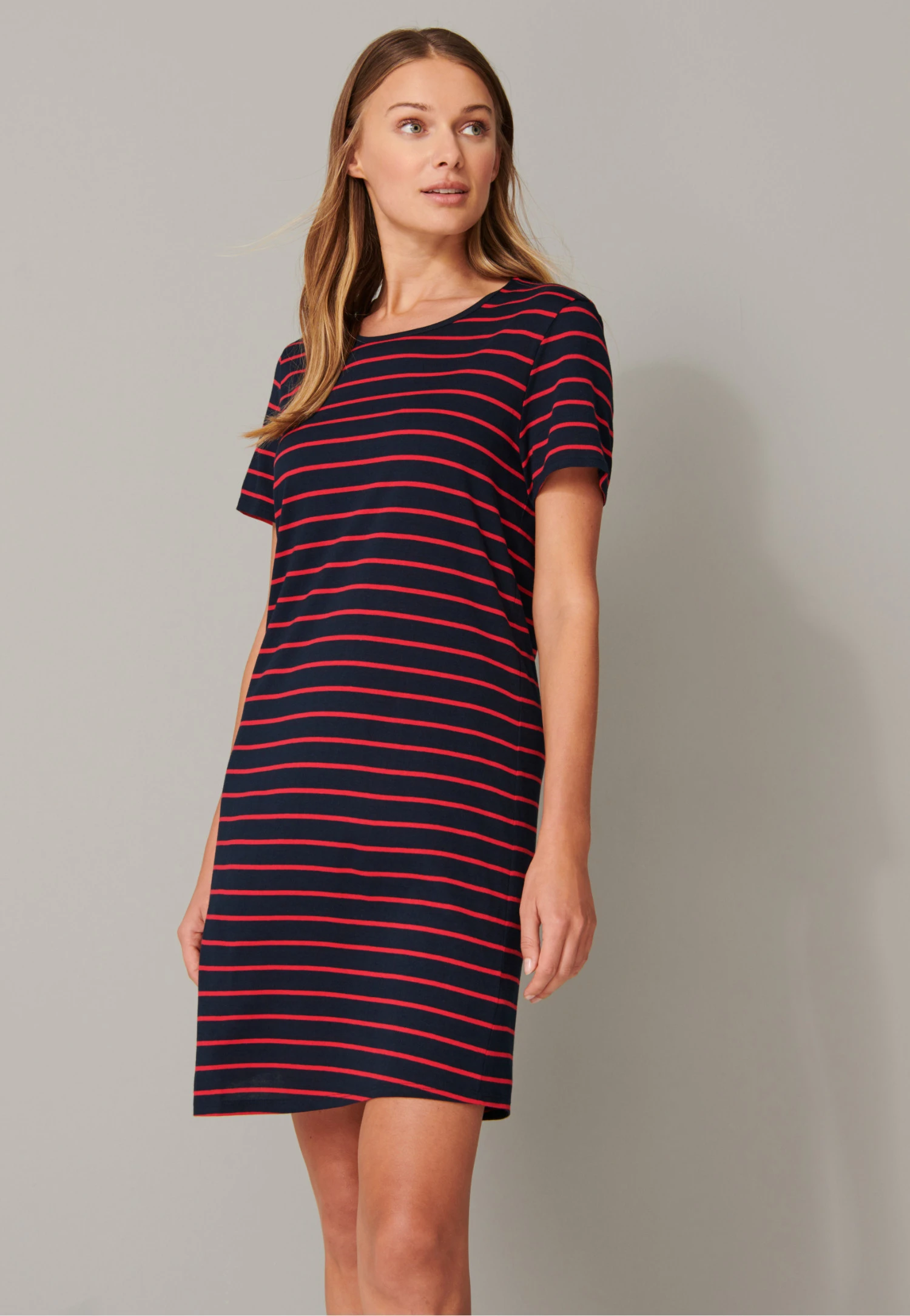 This short-sleeved black sleep shirt is just the thing for relaxing nights! Soft single jersey made from cotton and modal ensures maximum comfort and the red stripes give it a trendy look. A crew neck in contrasting black and the curved hem serve as charming details. A comfortable favorite in the best SCHIESSER quality!