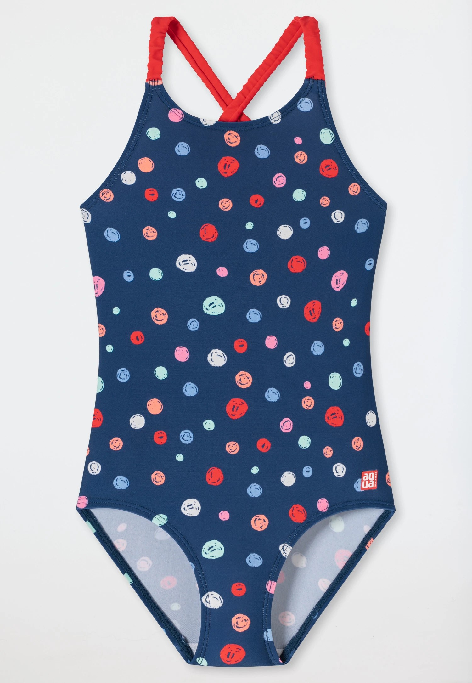 This pretty swimsuit is sure to make every little girl’s heart beat a little faster. The one-piece suit doesn’t just impress with its fashionable dark blue tone it’s also a real summer hit with its colorful all-over pattern of polka dots. Adjustable, ribbed straps in red ensure a perfect fit when swimming and diving. The comfortable knitwear with SPF 40+ provides your little mermaids with excellent protection against the sun totally natural and environmentally friendly in the best SCHIESSER quality.