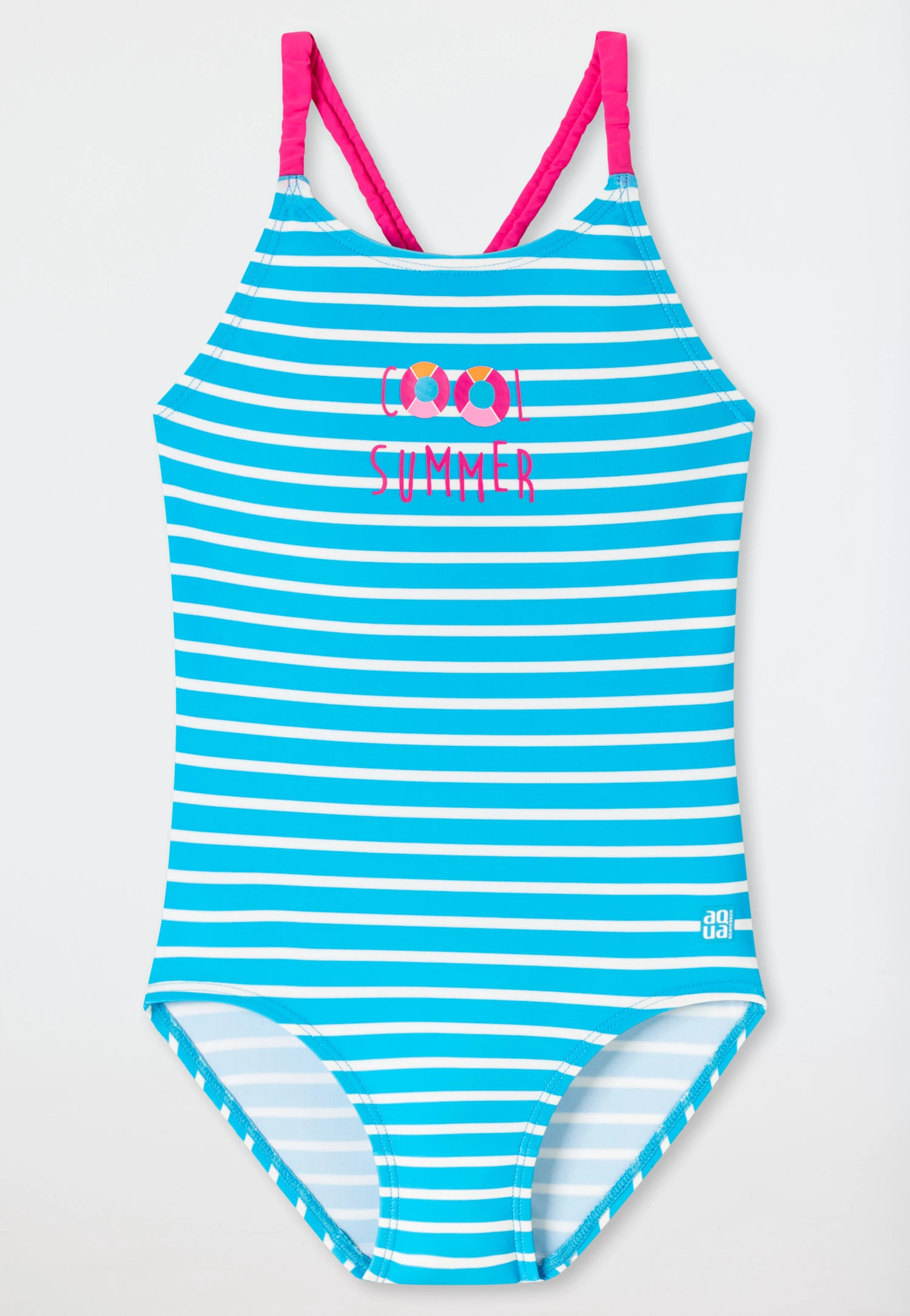 - striped swimsuit for girls in light blue and summer saying on the chest