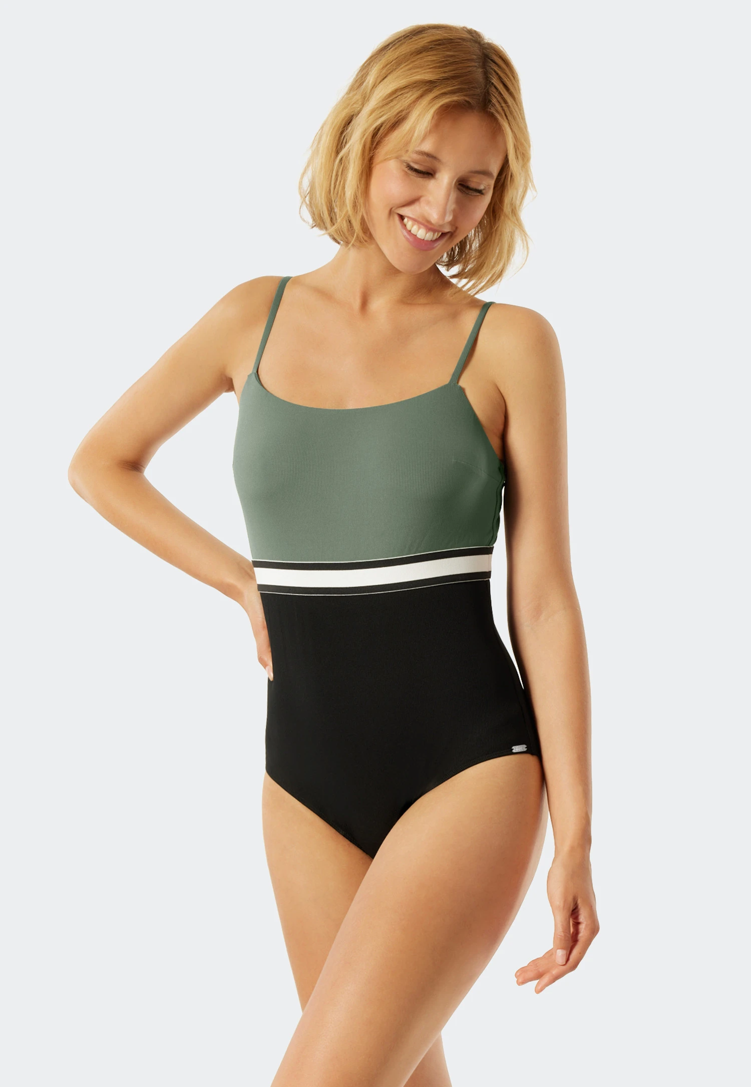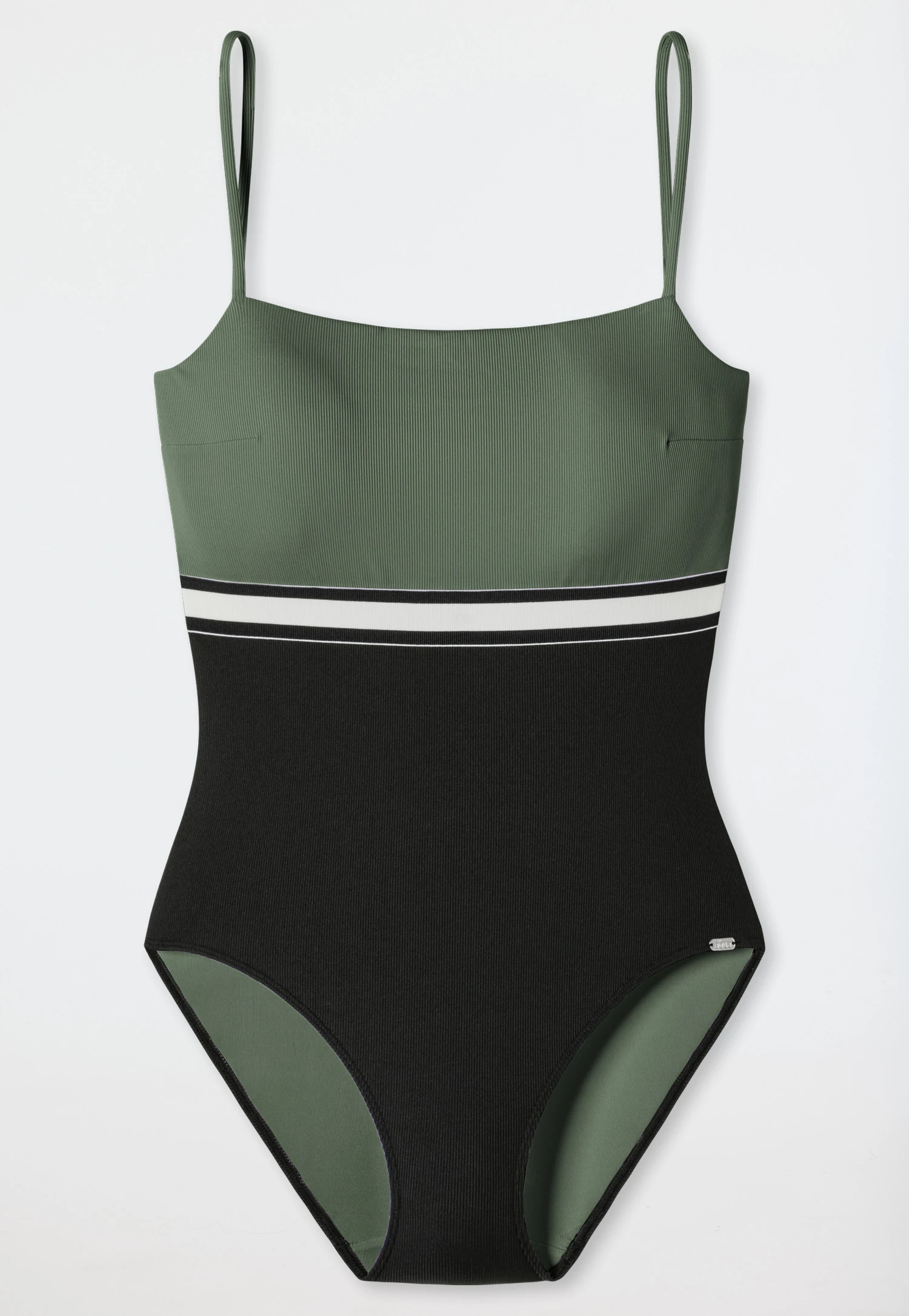 Feminine and wonderfully comfortable: this lined swimsuit is your new summer favorite! With its color block style and sporty, elastic underband in black and white, it ensures a great look at the beach and pool! The trendy rib look and fashionable, straight neckline go well with this. The adjustable straps ensure a perfect fit. The microfiber is not only particularly soft, but also sustainable thanks to its recycled content. Beachwear in the best SCHIESSER quality!
