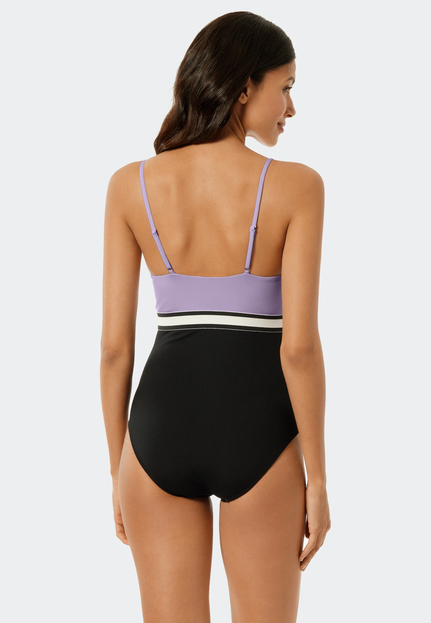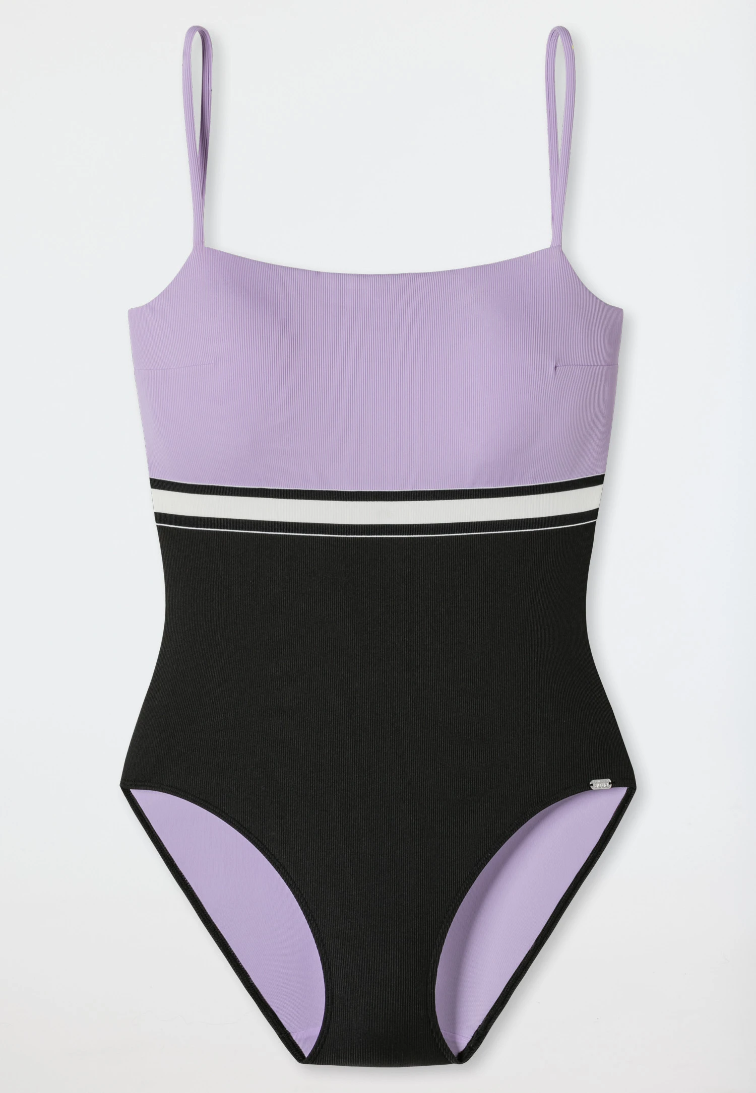 Feminine and wonderfully comfortable: this lined swimsuit is your new summer favorite! With its color block style and sporty, elastic underband in black and white, it ensures a great look at the beach and pool! The trendy rib look and fashionable, straight neckline go well with this. The adjustable straps ensure a perfect fit. The microfiber is not only particularly soft, but also sustainable thanks to its recycled content. Beachwear in the best SCHIESSER quality!