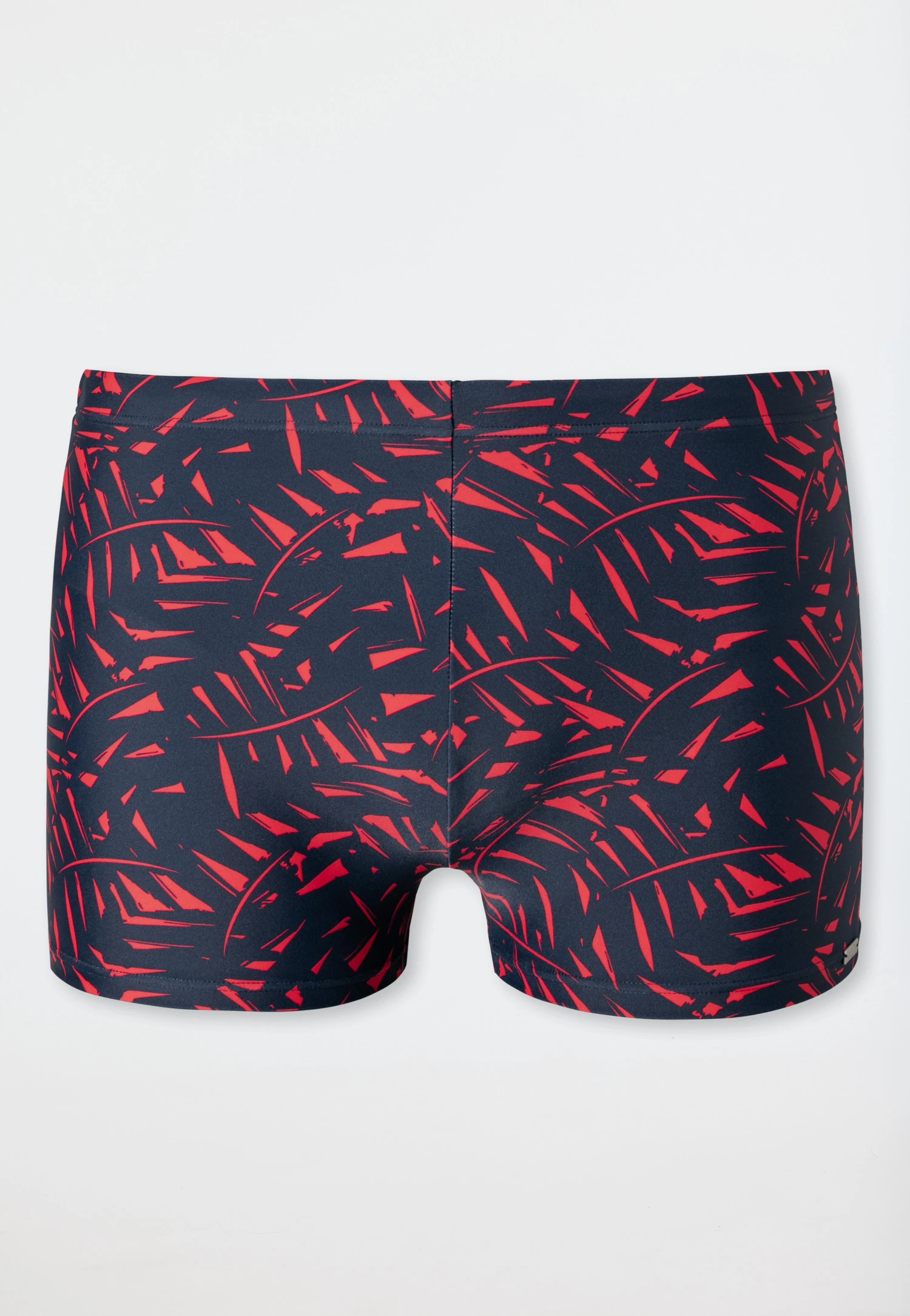- dark blue swim trunks for men with red leaf pattern