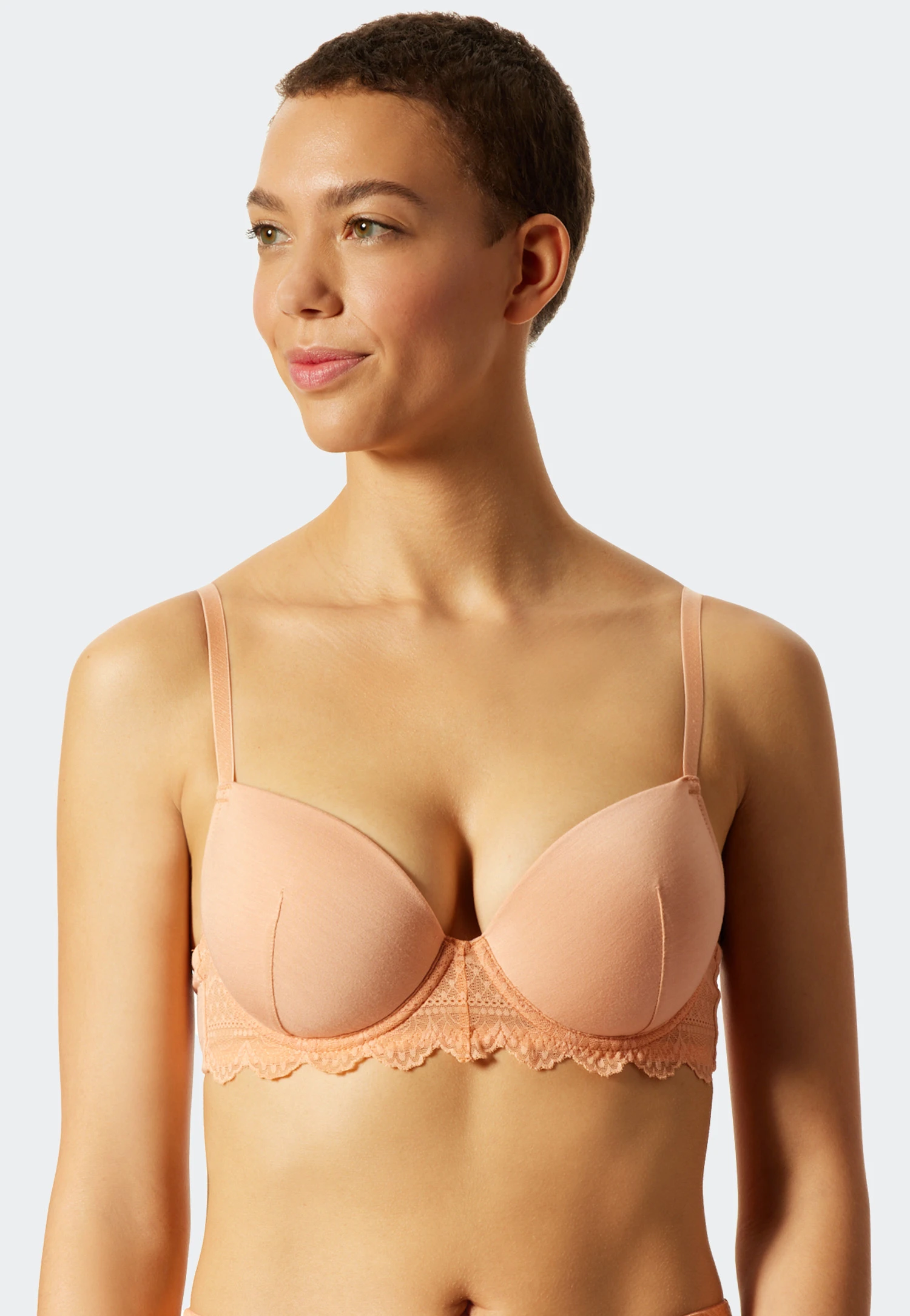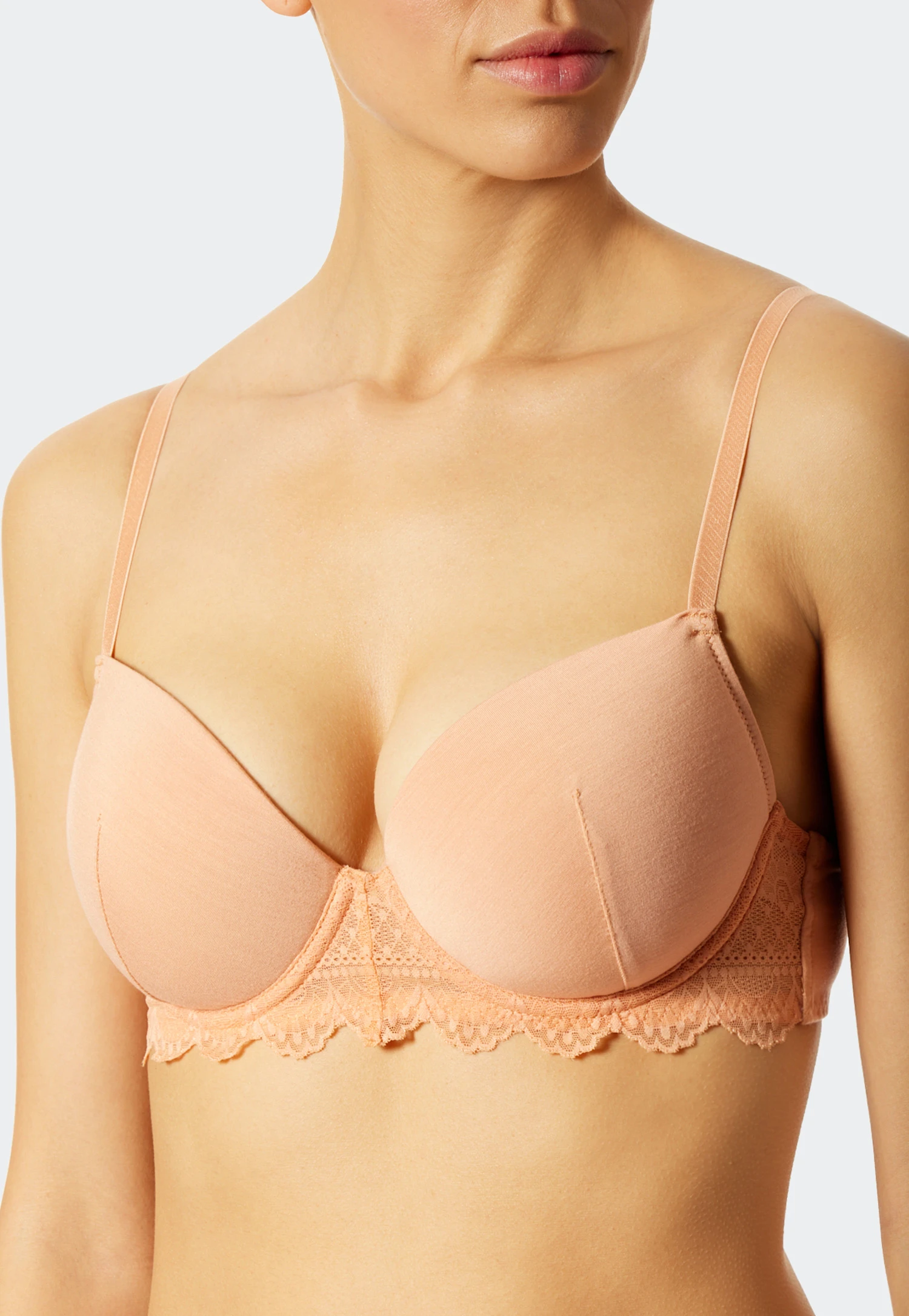 Do you like daywear that remains invisible even under tight-fitting tops? Then you’ll love this t-shirt bra with cups! The padded cups create gorgeous cleavage. The gently supporting underwires and adjustable straps ensure a perfect fit. Delicate lace on the edges and back gives the bra a touch of elegant sophistication, as does the pretty bow with rhinestones in the middle. Stretchy knitted fabrics are wonderfully soft. The finest SCHIESSER quality!