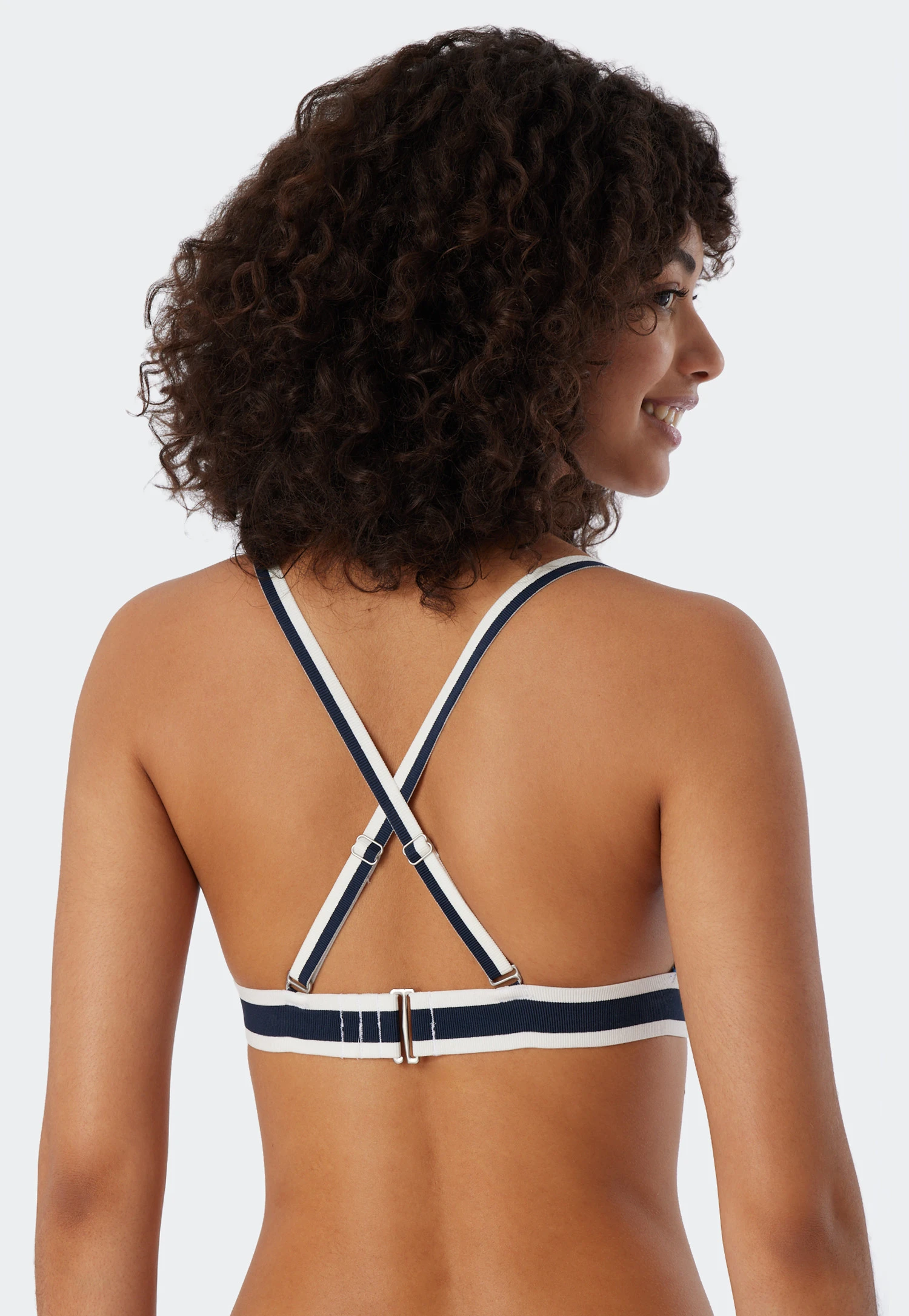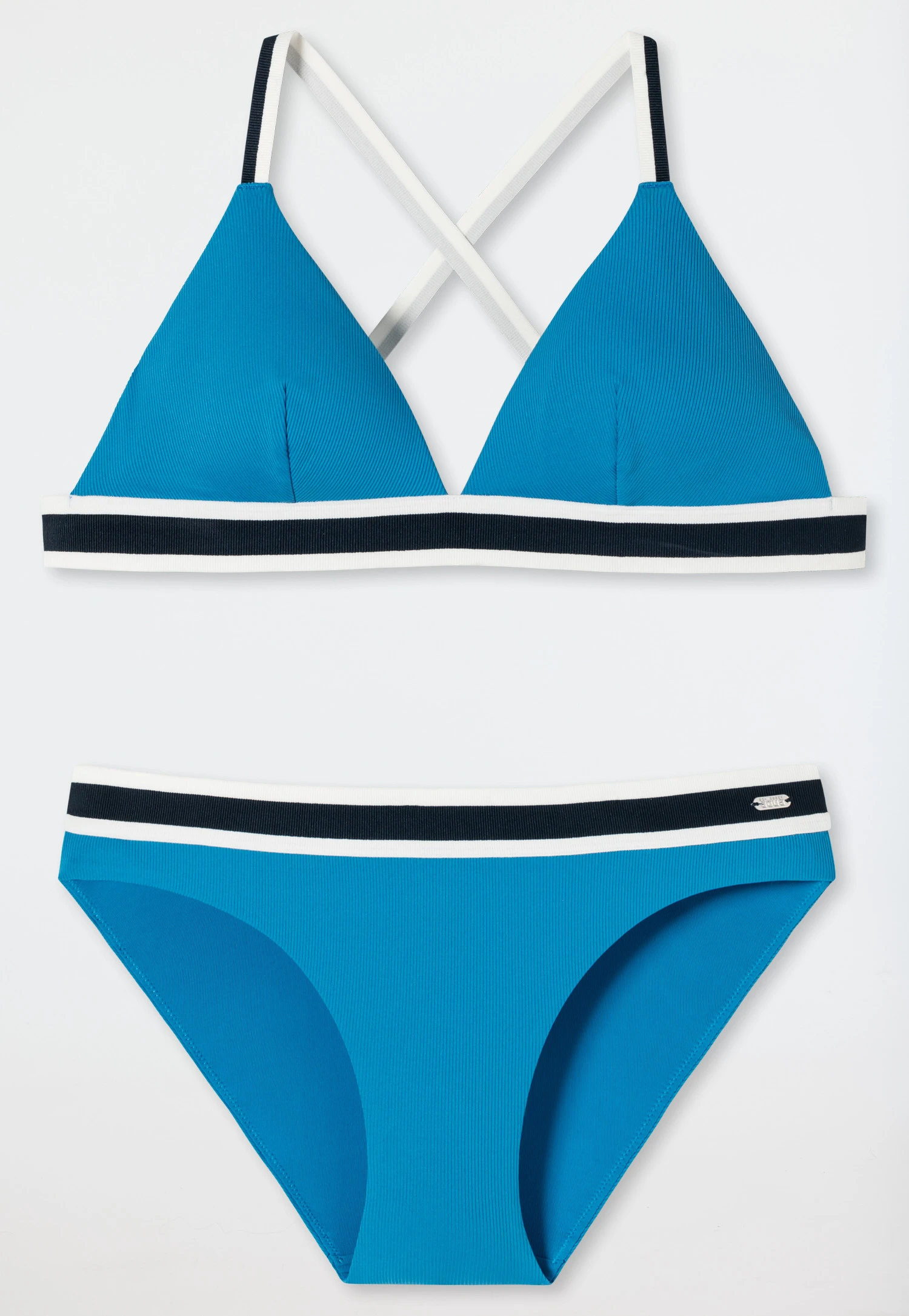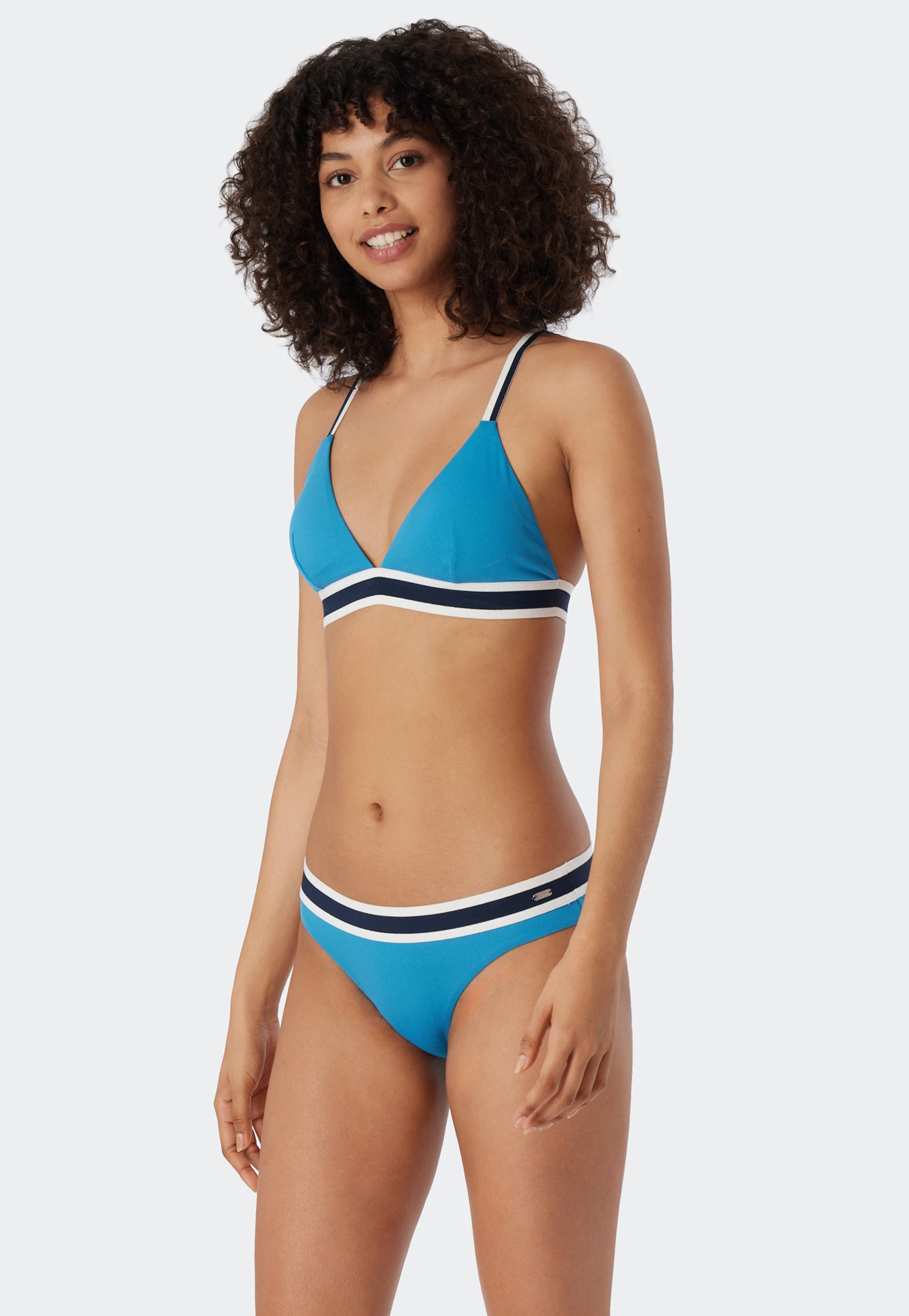 So sporty and yet so feminine: This lined triangle bikini in a ribbed look will delight you with its retro chic style! The top simply looks good with its straps and striped underbust band! You can wear it in a number of styles: The soft cups can be removed and the adjustable straps can be worn crossed or straight. The mini panties with the dark blue and white band are also wonderfully casual. The sustainable material feels soft against your skin. Best SCHIESSER quality!