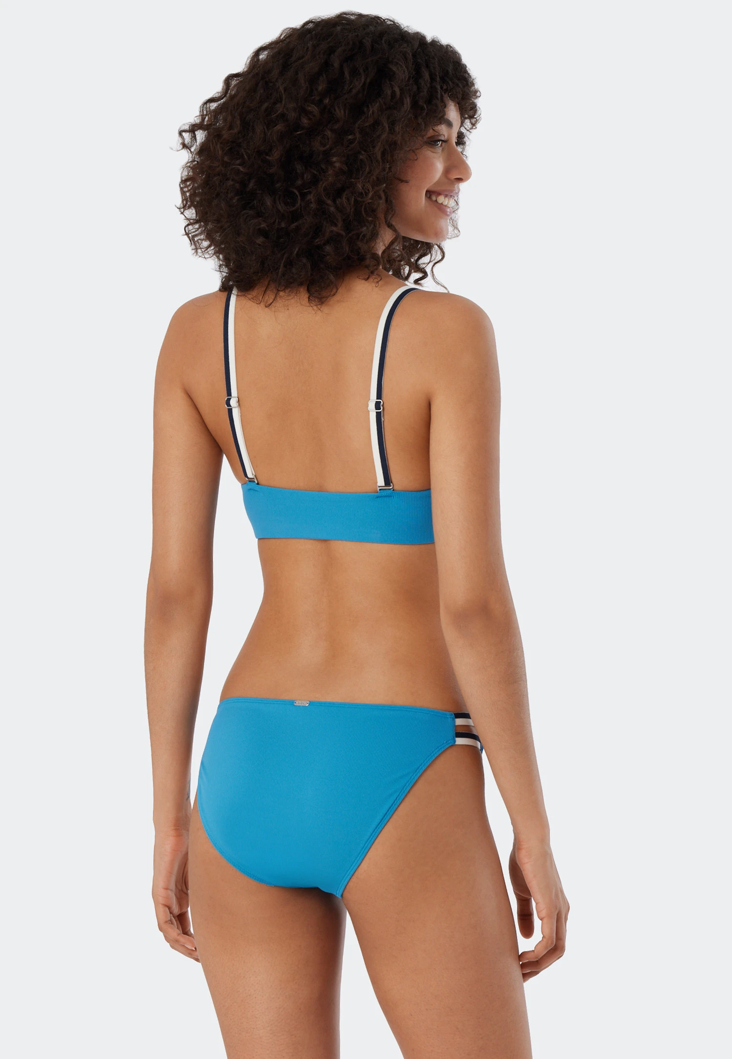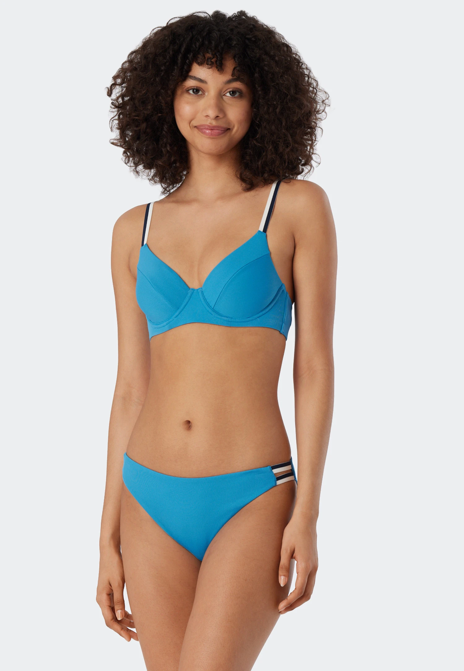 A sporty style and great colors: bring on the summer with this lined underwire bikini for women in a stylish ribbed look! The top looks downright great with its striped straps. These can be worn two ways: straight or crisscrossed. The comfortable straps provide support. The mini bottoms with pretty stripes on the sides that leave some skin exposed go well with the dynamic look. The cherry on top is the soft material made from recycled microfiber. The best, sustainable SCHIESSER quality!