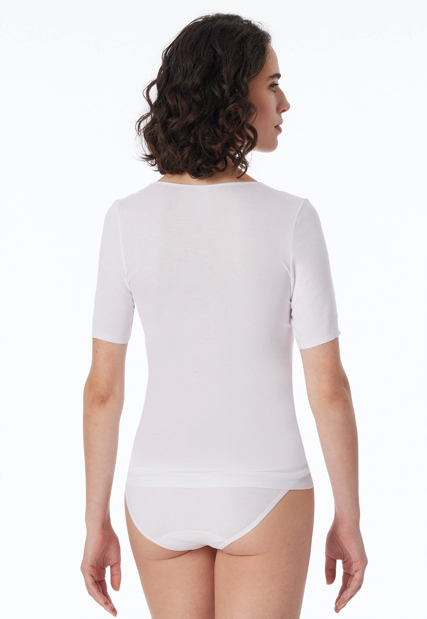 This white T-shirt from the SCHIESSER line “Luxury” is exactly right for ladies, who love the basics with a hint of luxury. 100% super combed maco-cotton, the conscious relinquishment of irritating side seams and extra-flat seamless edgings provide the spencer with a unique high wearing comfort, which is showcased with the silky shimmering edging on the neckline. An especially gentle, light shirt in first-class SCHIESSER quality.